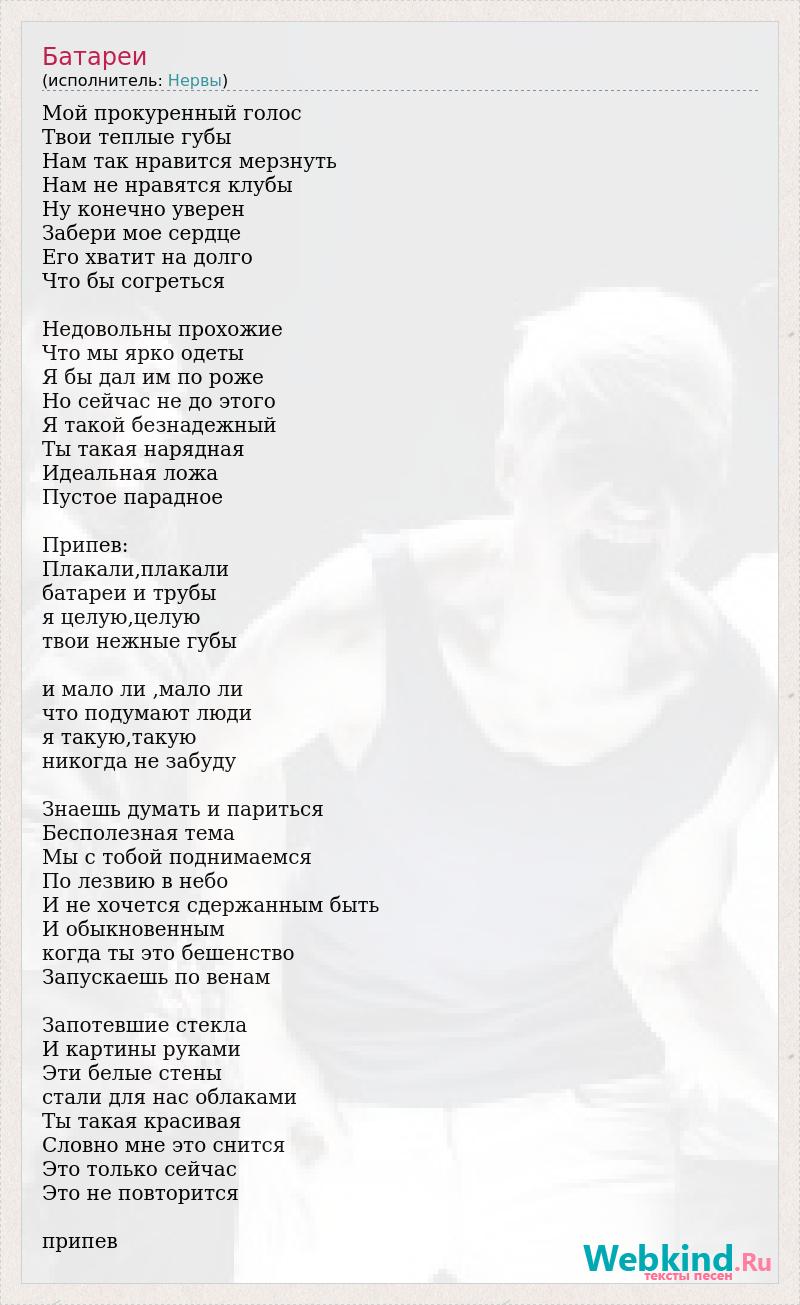 Мой прокуренный голос Твои теплые губы Нам так нравится мерзнуть Нам не нравятся клубы Ну конечно уверен Забери мое сердце Его хватит на долго Что бы согреться Недовольны прохожие Что мы ярко одеты Я бы дал им по роже Но сейчас не до этого Я такой безнадежный Ты такая нарядная Идеальная ложа Пустое парадное Припев: Плакали,плакали батареи и трубы я целую,целую твои нежные губы и мало ли ,мало ли что подумают люди я такую,такую никогда не забуду Знаешь думать и париться Бесполезная тема Мы с тобой поднимаемся По лезвию в небо И не хочется сдержанным быть И обыкновенным когда ты это бешенство Запускаешь по венам Запотевшие стекла И картины руками Эти белые стены стали для нас облаками Ты такая красивая Словно мне это снится Это только сейчас Это не повторится припев