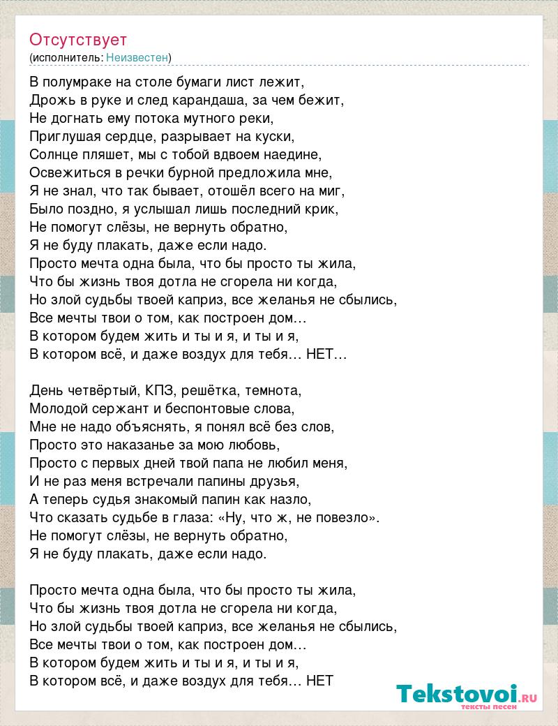 В полумраке на столе бумаги лист лежит, Дрожь в руке и след карандаша, за чем бежит, Не догнать ему потока мутного реки, Приглушая сердце, разрывает на куски, Солнце пляшет, мы с тобой вдвоем наедине, Освежиться в речки бурной предложила мне, Я не знал, что так бывает, отошёл всего на миг, Было поздно, я услышал лишь последний крик, Не помогут слёзы, не вернуть обратно, Я не буду плакать, даже если надо. Просто мечта одна была, что бы просто ты жила, Что бы жизнь твоя дотла не сгорела ни когда, Но злой судьбы твоей каприз, все желанья не сбылись, Все мечты твои о том, как построен дом… В котором будем жить и ты и я, и ты и я, В котором всё, и даже воздух для тебя… НЕТ… День четвёртый, КПЗ, решётка, темнота, Молодой сержант и беспонтовые слова, Мне не надо объяснять, я понял всё без слов, Просто это наказанье за мою любовь, Просто с первых дней твой папа не любил меня, И не раз меня встречали папины друзья, А теперь судья знакомый папин как назло, Что сказать судьбе в глаза: «Ну, что ж, не повезло». Не помогут слёзы, не вернуть обратно, Я не буду плакать, даже если надо. Просто мечта одна была, что бы просто ты жила, Что бы жизнь твоя дотла не сгорела ни когда, Но злой судьбы твоей каприз, все желанья не сбылись, Все мечты твои о том, как построен дом… В котором будем жить и ты и я, и ты и я, В котором всё, и даже воздух для тебя… НЕТ