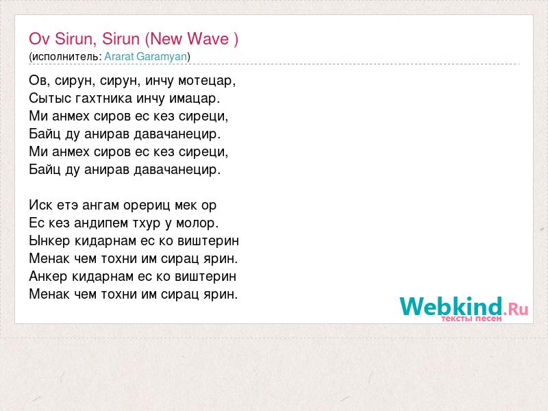 Ов, сирун, сирун, инчу мотецар, Сытыс гахтника инчу имацар. Ми анмех сиров ес кез сиреци, Байц ду анирав давачанецир. Ми анмех сиров ес кез сиреци, Байц ду анирав давачанецир. Иск етэ ангам орериц мек ор Ес кез андипем тхур у молор. Ынкер кидарнам ес ко виштерин Менак чем тохни им сирац ярин. Анкер кидарнам ес ко виштерин Менак чем тохни им сирац ярин.