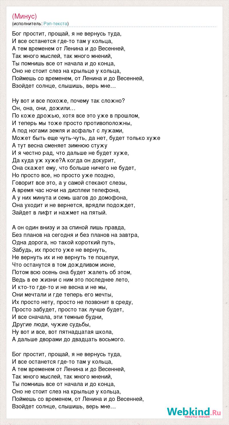 Бог простит, прощай, я не вернусь туда, И все останется где-то там у кольца, А тем временем от Ленина и до Весенней, Так много мыслей, так много мнений, Ты помнишь все от начала и до конца, Оно не стоит слез на крыльце у кольца, Поймешь со временем, от Ленина и до Весенней, Взойдет солнце, слышишь, верь мне… Ну вот и все похоже, почему так сложно? Он, она, они, дожили… По коже дрожью, хотя все это уже в прошлом, И теперь мы тоже просто противоположны, А под ногами земля и асфальт с лужами, Может быть еще чуть-чуть, да нет, будет только хуже А тут весна сменяет зимнюю стужу И я честно рад, что дальше не будет хуже, Да куда уж хуже?А когда он докурит, Она скажет ему, что больше ничего не будет, Но просто все, но просто уже поздно, Говорит все это, а у самой стекают слезы, А время час ночи на дисплеи телефона, А у них минута и семь шагов до домофона, Она уходит и не вернется, врядли подождет, Зайдет в лифт и нажмет на пятый. А он один внизу и за спиной лишь правда, Без планов на сегодня и без планов на завтра, Одна дорога, но такой короткий путь, Забудь, их просто уже не вернуть, Не вернуть их и не вернуть те поцелуи, Что останутся в том дождливом июне, Потом всю осень она будет жалеть об этом, Ведь в ее жизни с ним это последнее лето, И кто-то где-то и не весна и не мы, Они мечтали и где теперь его мечты, Их просто нету, просто не позвонит в среду, Просто забудет, просто так лучше будет, И все сначала, эти темные будни, Другие люди, чужие судьбы, Ну вот и все, вот пятнадцатая школа, А дальше дворами до двадцать восьмого. Бог простит, прощай, я не вернусь туда, И все останется где-то там у кольца, А тем временем от Ленина и до Весенней, Так много мыслей, так много мнений, Ты помнишь все от начала и до конца, Оно не стоит слез на крыльце у кольца, Поймешь со временем, от Ленина и до Весенней, Взойдет солнце, слышишь, верь мне…
