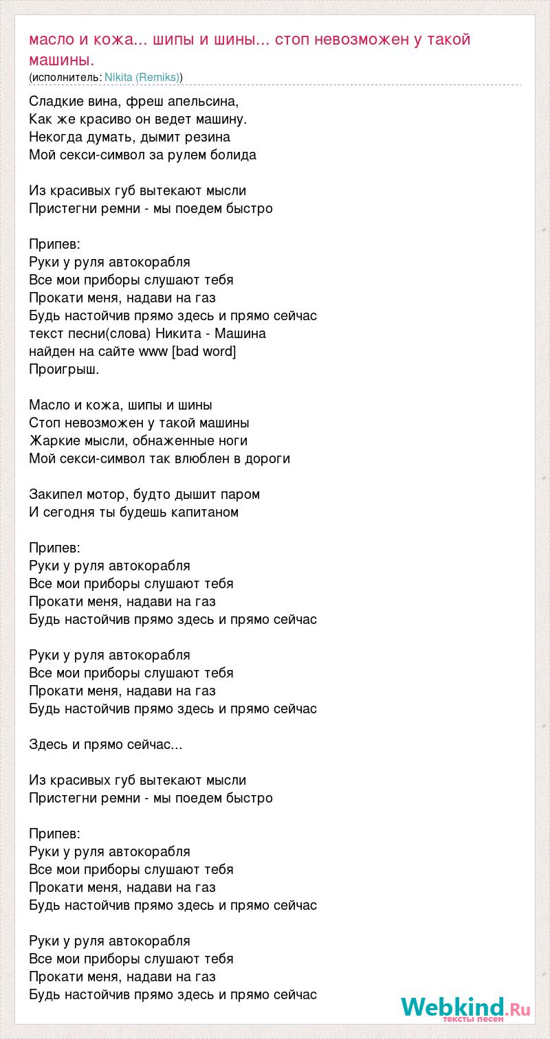 Сладкие вина, фреш апельсина, Как же красиво он ведет машину. Некогда думать, дымит резина Мой секси-символ за рулем болида Из красивых губ вытекают мысли Пристегни ремни - мы поедем быстро Припев: Руки у руля автокорабля Все мои приборы слушают тебя Прокати меня, надави на газ Будь настойчив прямо здесь и прямо сейчас текст песни(слова) Никита - Машина найден на сайте www [bad word] Проигрыш. Масло и кожа, шипы и шины Стоп невозможен у такой машины Жаркие мысли, обнаженные ноги Мой секси-символ так влюблен в дороги Закипел мотор, будто дышит паром И сегодня ты будешь капитаном Припев: Руки у руля автокорабля Все мои приборы слушают тебя Прокати меня, надави на газ Будь настойчив прямо здесь и прямо сейчас Руки у руля автокорабля Все мои приборы слушают тебя Прокати меня, надави на газ Будь настойчив прямо здесь и прямо сейчас Здесь и прямо сейчас... Из красивых губ вытекают мысли Пристегни ремни - мы поедем быстро Припев: Руки у руля автокорабля Все мои приборы слушают тебя Прокати меня, надави на газ Будь настойчив прямо здесь и прямо сейчас Руки у руля автокорабля Все мои приборы слушают тебя Прокати меня, надави на газ Будь настойчив прямо здесь и прямо сейчас