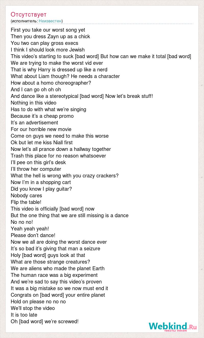 First you take our worst song yet Then you dress Zayn up as a chick You two can play gross execs I think I should look more Jewish This video’s starting to suck [bad word] But how can we make it total [bad word] We are trying to make the worst vid ever That is why Harry is dressed up like a nerd What about Liam though? He needs a character How about a homo choreographer? And I can go oh oh oh And dance like a stereotypical [bad word] Now let’s break stuff! Nothing in this video Has to do with what we’re singing Because it’s a cheap promo It’s an advertisement For our horrible new movie Come on guys we need to make this worse Ok but let me kiss Niall first Now let’s all prance down a hallway together Trash this place for no reason whatsoever I’ll pee on this girl’s desk I’ll throw her computer What the hell is wrong with you crazy crackers? Now I’m in a shopping cart Did you know I play guitar? Nobody cares Flip the table! This video is officially [bad word] now But the one thing that we are still missing is a dance No no no! Yeah yeah yeah! Please don’t dance! Now we all are doing the worst dance ever It’s so bad it’s giving that man a seizure Holy [bad word] guys look at that What are those strange creatures? We are aliens who made the planet Earth The human race was a big experiment And we’re sad to say this video’s proven It was a big mistake so we now must end it Congrats on [bad word] your entire planet Hold on please no no no We’ll stop the video It is too late Oh [bad word] we’re screwed!