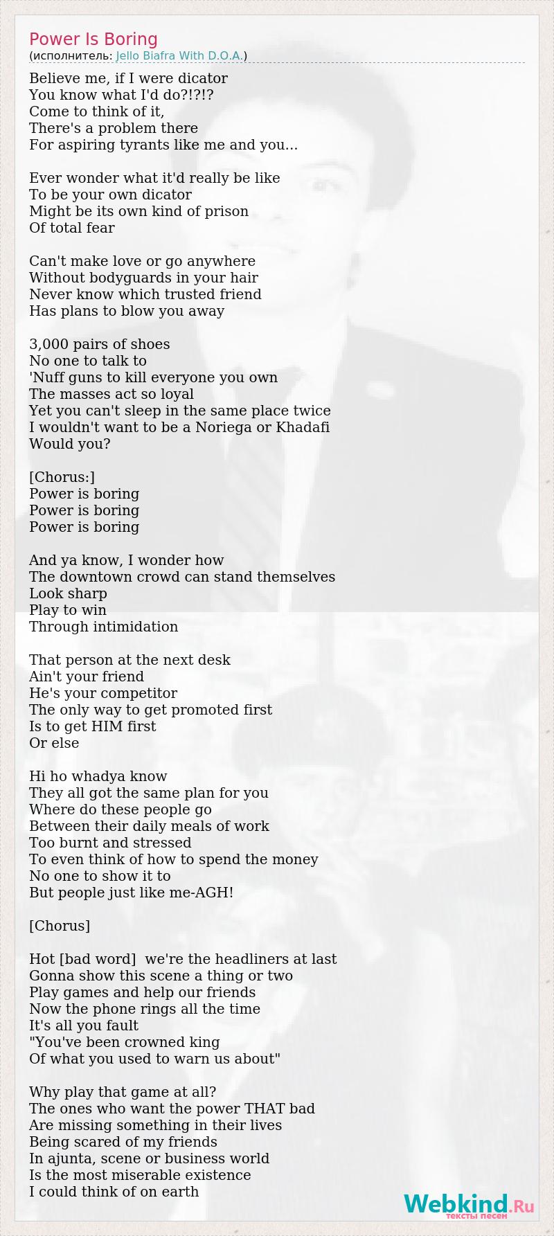 Believe me, if I were dicator You know what I'd do?!?!? Come to think of it, There's a problem there For aspiring tyrants like me and you... Ever wonder what it'd really be like To be your own dicator Might be its own kind of prison Of total fear Can't make love or go anywhere Without bodyguards in your hair Never know which trusted friend Has plans to blow you away 3,000 pairs of shoes No one to talk to 'Nuff guns to kill everyone you own The masses act so loyal Yet you can't sleep in the same place twice I wouldn't want to be a Noriega or Khadafi Would you? [Chorus:] Power is boring Power is boring Power is boring And ya know, I wonder how The downtown crowd can stand themselves Look sharp Play to win Through intimidation That person at the next desk Ain't your friend He's your competitor The only way to get promoted first Is to get HIM first Or else Hi ho whadya know They all got the same plan for you Where do these people go Between their daily meals of work Too burnt and stressed To even think of how to spend the money No one to show it to But people just like me-AGH! [Chorus] Hot [bad word] we're the headliners at last Gonna show this scene a thing or two Play games and help our friends Now the phone rings all the time It's all you fault "You've been crowned king Of what you used to warn us about" Why play that game at all? The ones who want the power THAT bad Are missing something in their lives Being scared of my friends In ajunta, scene or business world Is the most miserable existence I could think of on earth