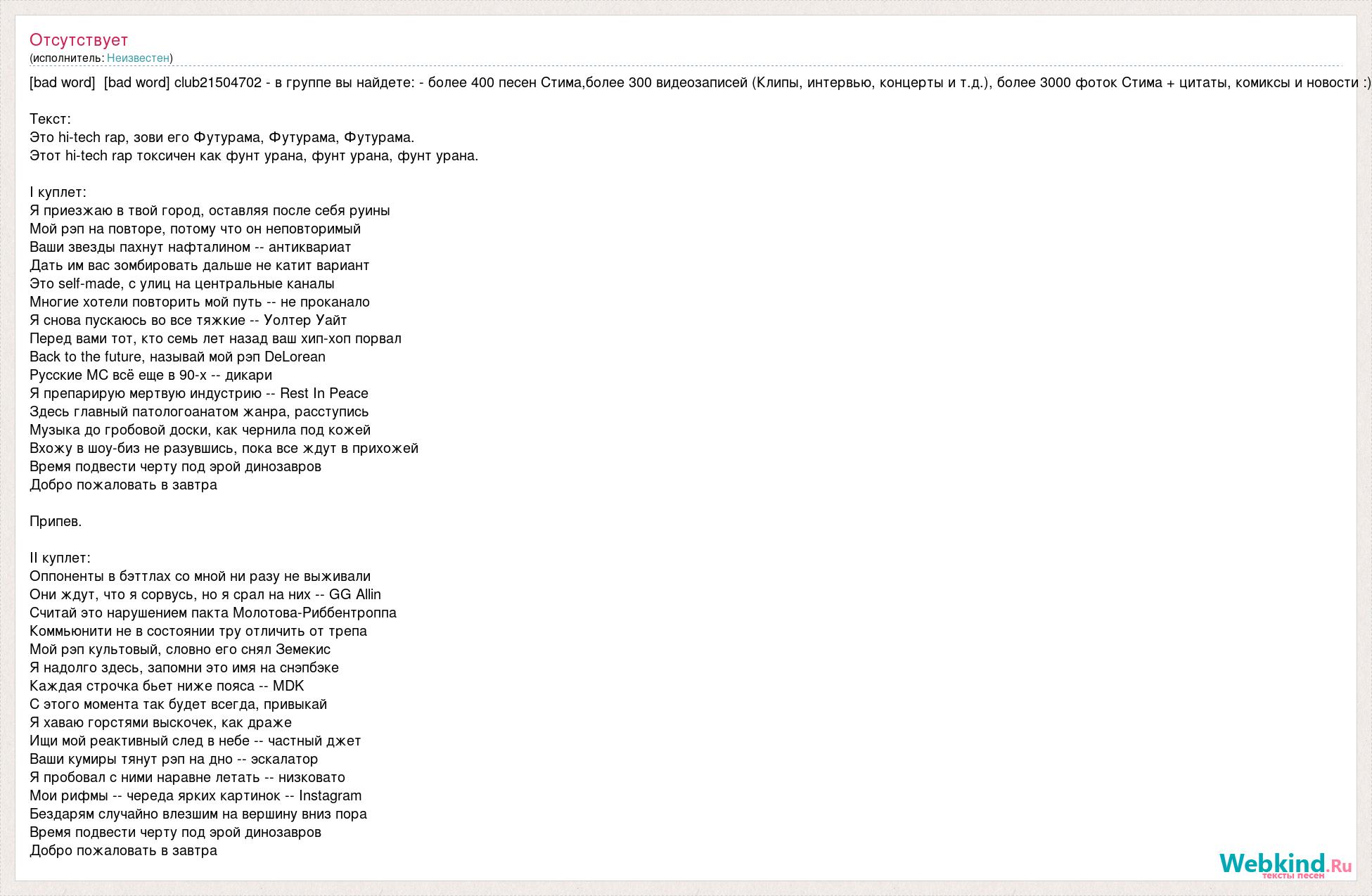 [bad word] [bad word] club21504702 - в группе вы найдете: - более 400 песен Стима,более 300 видеозаписей (Клипы, интервью, концерты и т.д.), более 3000 фоток Стима + цитаты, комиксы и новости :) Текст: Это hi-tech rap, зови его Футурама, Футурама, Футурама. Этот hi-tech rap токсичен как фунт урана, фунт урана, фунт урана. I куплет: Я приезжаю в твой город, оставляя после себя руины Мой рэп на повторе, потому что он неповторимый Ваши звезды пахнут нафталином -- антиквариат Дать им вас зомбировать дальше не катит вариант Это self-made, с улиц на центральные каналы Многие хотели повторить мой путь -- не проканало Я снова пускаюсь во все тяжкие -- Уолтер Уайт Перед вами тот, кто семь лет назад ваш хип-хоп порвал Back to the future, называй мой рэп DeLorean Русские MC всё еще в 90-х -- дикари Я препарирую мертвую индустрию -- Rest In Peace Здесь главный патологоанатом жанра, расступись Музыка до гробовой доски, как чернила под кожей Вхожу в шоу-биз не разувшись, пока все ждут в прихожей Время подвести черту под эрой динозавров Добро пожаловать в завтра Припев. II куплет: Оппоненты в бэттлах со мной ни разу не выживали Они ждут, что я сорвусь, но я срал на них -- GG Allin Считай это нарушением пакта Молотова-Риббентроппа Коммьюнити не в состоянии тру отличить от трепа Мой рэп культовый, словно его снял Земекис Я надолго здесь, запомни это имя на снэпбэке Каждая строчка бьет ниже пояса -- MDK С этого момента так будет всегда, привыкай Я хаваю горстями выскочек, как драже Ищи мой реактивный след в небе -- частный джет Ваши кумиры тянут рэп на дно -- эскалатор Я пробовал с ними наравне летать -- низковато Мои рифмы -- череда ярких картинок -- Instagram Бездарям случайно влезшим на вершину вниз пора Время подвести черту под эрой динозавров Добро пожаловать в завтра