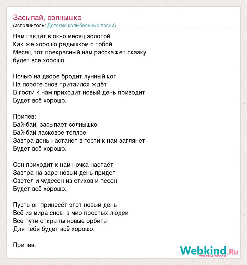 Нам глядит в окно месяц золотой Как же хорошо рядышком с тобой Месяц тот прекрасный нам расскажет сказку будет всё хорошо. Ночью на дворе бродит лунный кот На пороге снов притаился ждёт В гости к нам приходит новый день приводит Будет всё хорошо. Припев: Бай-бай, засыпает солнышко Бай-бай ласковое теплое Завтра день настанет в гости к нам заглянет Будет всё хорошо. Сон приходит к нам ночка настаёт Завтра на заре новый день придет Светел и чудесен из стихов и песен Будет всё хорошо. Пусть он принесёт этот новый день Всё из мира снов в мир простых людей Все пути открыты новые орбиты Для тебя будет всё хорошо. Припев.