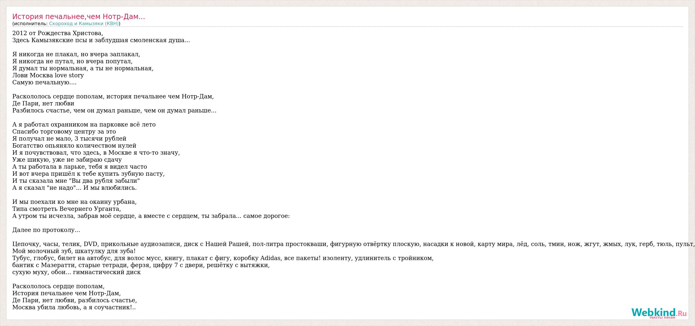 2012 от Рождества Христова, Здесь Камызякские псы и заблудшая смоленская душа... Я никогда не плакал, но вчера заплакал, Я никогда не путал, но вчера попутал, Я думал ты нормальная, а ты не нормальная, Лови Москва love story Самую печальную.... Раскололось сердце пополам, история печальнее чем Нотр-Дам, Де Пари, нет любви Разбилось счастье, чем он думал раньше, чем он думал раньше... А я работал охранником на парковке всё лето Спасибо торговому центру за это Я получал не мало, 3 тысячи рублей Богатство опьяняло количеством нулей И я почувствовал, что здесь, в Москве я что-то значу, Уже шикую, уже не забираю сдачу А ты работала в ларьке, тебя я видел часто И вот вчера пришёл к тебе купить зубную пасту, И ты сказала мне "Вы два рубля забыли" А я сказал "не надо"... И мы влюбились. И мы поехали ко мне на окаину урбана, Типа смотреть Вечернего Урганта, А утром ты исчезла, забрав моё сердце, а вместе с сердцем, ты забрала... самое дорогое: Далее по протоколу... Цепочку, часы, телик, DVD, прикольные аудиозаписи, диск с Нашей Рашей, пол-литра простокваши, фигурную отвёртку плоскую, насадки к новой, карту мира, лёд, соль, тмин, нож, жгут, жмых, лук, герб, тюль, пульт, Мой молочный зуб, шкатулку для зуба! Тубус, глобус, билет на автобус, для волос мусс, книгу, плакат с фигу, коробку Adidas, все пакеты! изоленту, удлинитель с тройником, бантик с Мазератти, старые тетради, ферзя, цифру 7 с двери, решётку с вытяжки, сухую муху, обои... гимнастический диск Раскололось сердце пополам, История печальнее чем Нотр-Дам, Де Пари, нет любви, разбилось счастье, Москва убила любовь, а я соучастник!..