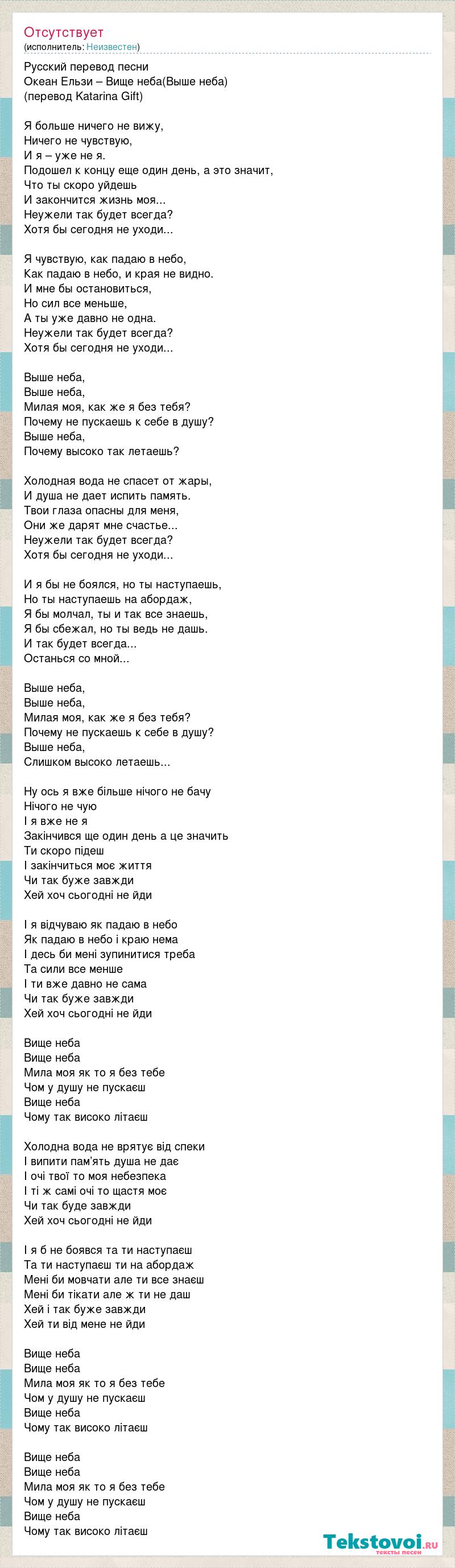 Русский перевод песни Океан Ельзи – Вище неба(Выше неба) (перевод Katarina Gift) Я больше ничего не вижу, Ничего не чувствую, И я – уже не я. Подошел к концу еще один день, а это значит, Что ты скоро уйдешь И закончится жизнь моя... Неужели так будет всегда? Хотя бы сегодня не уходи... Я чувствую, как падаю в небо, Как падаю в небо, и края не видно. И мне бы остановиться, Но сил все меньше, А ты уже давно не одна. Неужели так будет всегда? Хотя бы сегодня не уходи... Выше неба, Выше неба, Милая моя, как же я без тебя? Почему не пускаешь к себе в душу? Выше неба, Почему высоко так летаешь? Холодная вода не спасет от жары, И душа не дает испить память. Твои глаза опасны для меня, Они же дарят мне счастье... Неужели так будет всегда? Хотя бы сегодня не уходи... И я бы не боялся, но ты наступаешь, Но ты наступаешь на абордаж, Я бы молчал, ты и так все знаешь, Я бы сбежал, но ты ведь не дашь. И так будет всегда... Останься со мной... Выше неба, Выше неба, Милая моя, как же я без тебя? Почему не пускаешь к себе в душу? Выше неба, Слишком высоко летаешь... Ну ось я вже більше нічого не бачу Нічого не чую І я вже не я Закінчився ще один день а це значить Ти скоро підеш І закінчиться моє життя Чи так буже завжди Хей хоч сьогодні не йди І я відчуваю як падаю в небо Як падаю в небо і краю нема І десь би мені зупинитися треба Та сили все менше І ти вже давно не сама Чи так буже завжди Хей хоч сьогодні не йди Вище неба Вище неба Мила моя як то я без тебе Чом у душу не пускаєш Вище неба Чому так високо літаєш Холодна вода не врятує від спеки І випити пам’ять душа не дає І очі твої то моя небезпека І ті ж самі очі то щастя моє Чи так буде завжди Хей хоч сьогодні не йди І я б не боявся та ти наступаєш Та ти наступаєш ти на абордаж Мені би мовчати але ти все знаєш Мені би тікати але ж ти не даш Хей і так буже завжди Хей ти від мене не йди Вище неба Вище неба Мила моя як то я без тебе Чом у душу не пускаєш Вище неба Чому так високо літаєш Вище неба Вище неба Мила моя як то я без тебе Чом у душу не пускаєш Вище неба Чому так високо літаєш