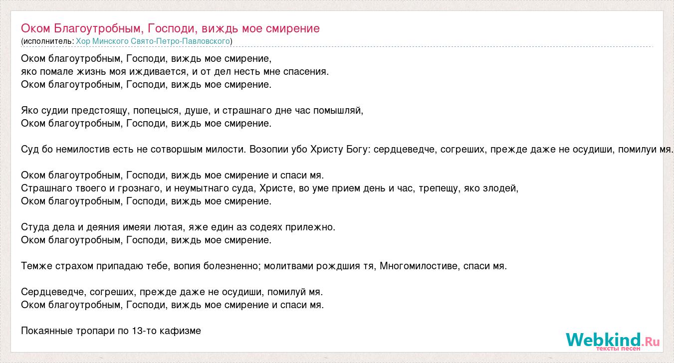Оком благоутробным, Господи, виждь мое смирение, яко помале жизнь моя иждивается, и от дел несть мне спасения. Оком благоутробным, Господи, виждь мое смирение. Яко судии предстоящу, попецыся, душе, и страшнаго дне час помышляй, Оком благоутробным, Господи, виждь мое смирение. Суд бо немилостив есть не сотворшым милости. Возопии убо Христу Богу: сердцевeдче, согрeших, прежде даже не осудиши, помилуи мя. Оком благоутробным, Господи, виждь мое смирение и спаси мя. Страшнаго твоего и грознаго, и неумытнаго суда, Христе, во уме приeм день и час, трепещу, яко злодей, Оком благоутробным, Господи, виждь мое смирение. Студа дела и деяния имeяи лютая, яже един аз содеях прилежно. Оком благоутробным, Господи, виждь мое смирение. Темже страхом припадаю тебe, вопия болезненно; молитвами рождшия тя, Многомилостиве, спаси мя. Сердцеведче, согреших, прежде даже не осудиши, помилуй мя. Оком благоутробным, Господи, виждь мое смирение и спаси мя. Покаянные тропари по 13-то кафизме