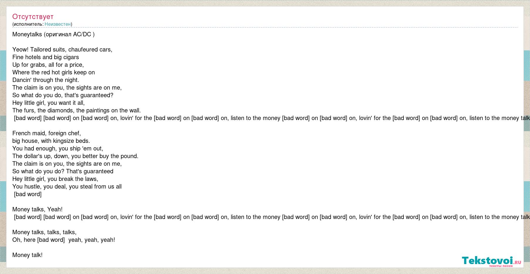 Moneytalks (оригинал AC/DC ) Yeow! Tailored suits, chaufeured cars, Fine hotels and big cigars Up for grabs, all for a price, Where the red hot girls keep on Dancin' through the night. The claim is on you, the sights are on me, So what do you do, that's guaranteed? Hey little girl, you want it all, The furs, the diamonds, the paintings on the wall. [Chorus:] Come on, come on, lovin' for the money, Come on, come on, listen to the money talk Come on, come on, lovin' for the money, Come on, come on, listen to the money talk French maid, foreign chef, big house, with kingsize beds. You had enough, you ship 'em out, The dollar's up, down, you better buy the pound. The claim is on you, the sights are on me, So what do you do? That's guaranteed Hey little girl, you break the laws, You hustle, you deal, you steal from us all [Chorus] Money talks, Yeah! [Chorus:] Come on, come on, lovin' for the money, Come on, come on, listen to the money talk Come on, come on, lovin' for the money, Come on, come on, listen to the money talk Money talks, talks, talks, Oh, here it comes, yeah, yeah, yeah! Money talk!