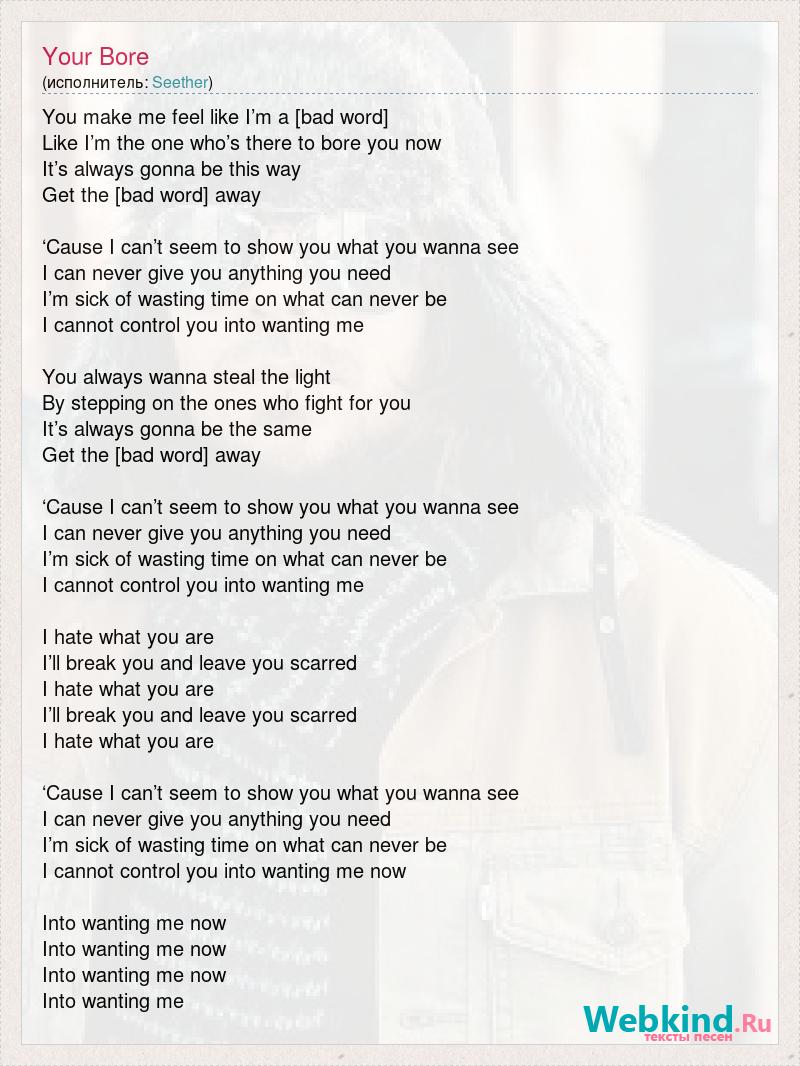 You make me feel like I’m a [bad word] Like I’m the one who’s there to bore you now It’s always gonna be this way Get the [bad word] away ‘Cause I can’t seem to show you what you wanna see I can never give you anything you need I’m sick of wasting time on what can never be I cannot control you into wanting me You always wanna steal the light By stepping on the ones who fight for you It’s always gonna be the same Get the [bad word] away ‘Cause I can’t seem to show you what you wanna see I can never give you anything you need I’m sick of wasting time on what can never be I cannot control you into wanting me I hate what you are I’ll break you and leave you scarred I hate what you are I’ll break you and leave you scarred I hate what you are ‘Cause I can’t seem to show you what you wanna see I can never give you anything you need I’m sick of wasting time on what can never be I cannot control you into wanting me now Into wanting me now Into wanting me now Into wanting me now Into wanting me