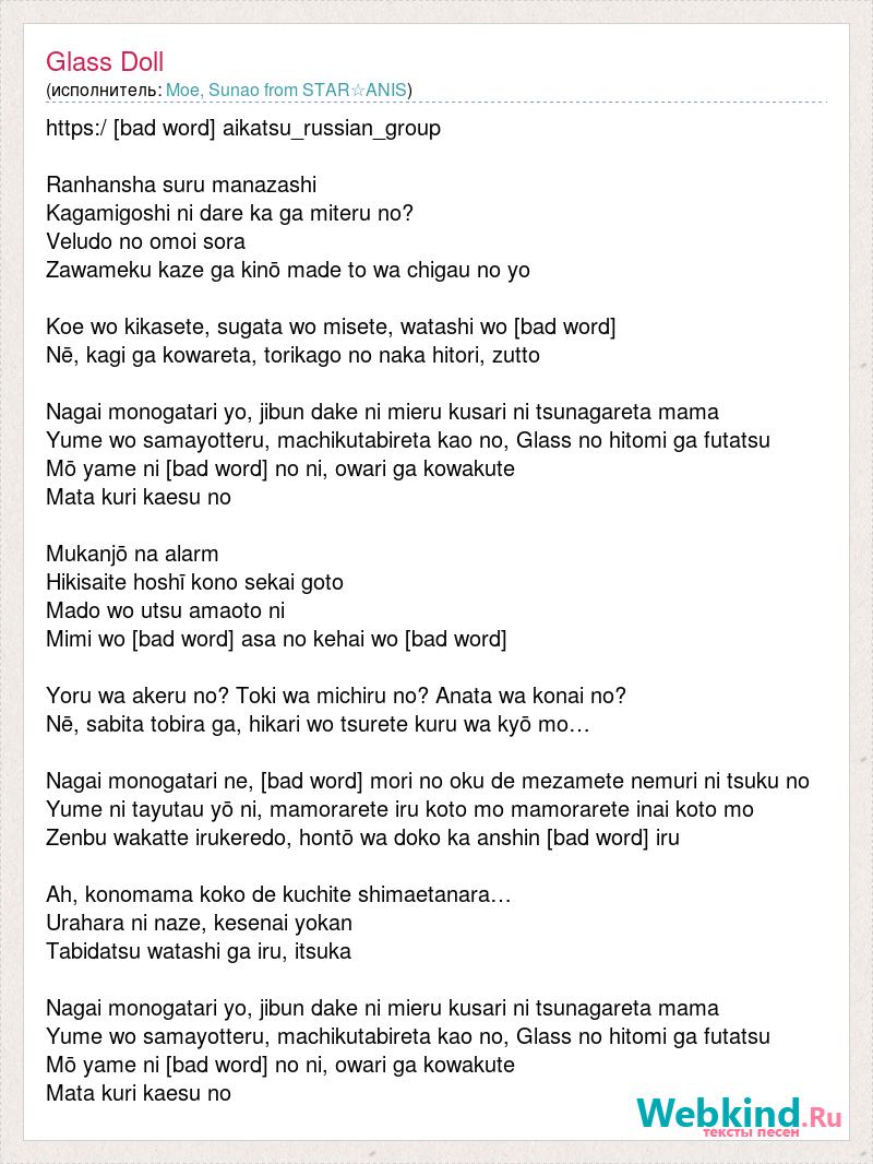 https:/ [bad word] aikatsu_russian_group Ranhansha suru manazashi Kagamigoshi ni dare ka ga miteru no? Veludo no omoi sora Zawameku kaze ga kinō made to wa chigau no yo Koe wo kikasete, sugata wo misete, watashi wo [bad word] Nē, kagi ga kowareta, torikago no naka hitori, zutto Nagai monogatari yo, jibun dake ni mieru kusari ni tsunagareta mama Yume wo samayotteru, machikutabireta kao no, Glass no hitomi ga futatsu Mō yame ni [bad word] no ni, owari ga kowakute Mata kuri kaesu no Mukanjō na alarm Hikisaite hoshī kono sekai goto Mado wo utsu amaoto ni Mimi wo [bad word] asa no kehai wo [bad word] Yoru wa akeru no? Toki wa michiru no? Anata wa konai no? Nē, sabita tobira ga, hikari wo tsurete kuru wa kyō mo… Nagai monogatari ne, [bad word] mori no oku de mezamete nemuri ni tsuku no Yume ni tayutau yō ni, mamorarete iru koto mo mamorarete inai koto mo Zenbu wakatte irukeredo, hontō wa doko ka anshin [bad word] iru Ah, konomama koko de kuchite shimaetanara… Urahara ni naze, kesenai yokan Tabidatsu watashi ga iru, itsuka Nagai monogatari yo, jibun dake ni mieru kusari ni tsunagareta mama Yume wo samayotteru, machikutabireta kao no, Glass no hitomi ga futatsu Mō yame ni [bad word] no ni, owari ga kowakute Mata kuri kaesu no