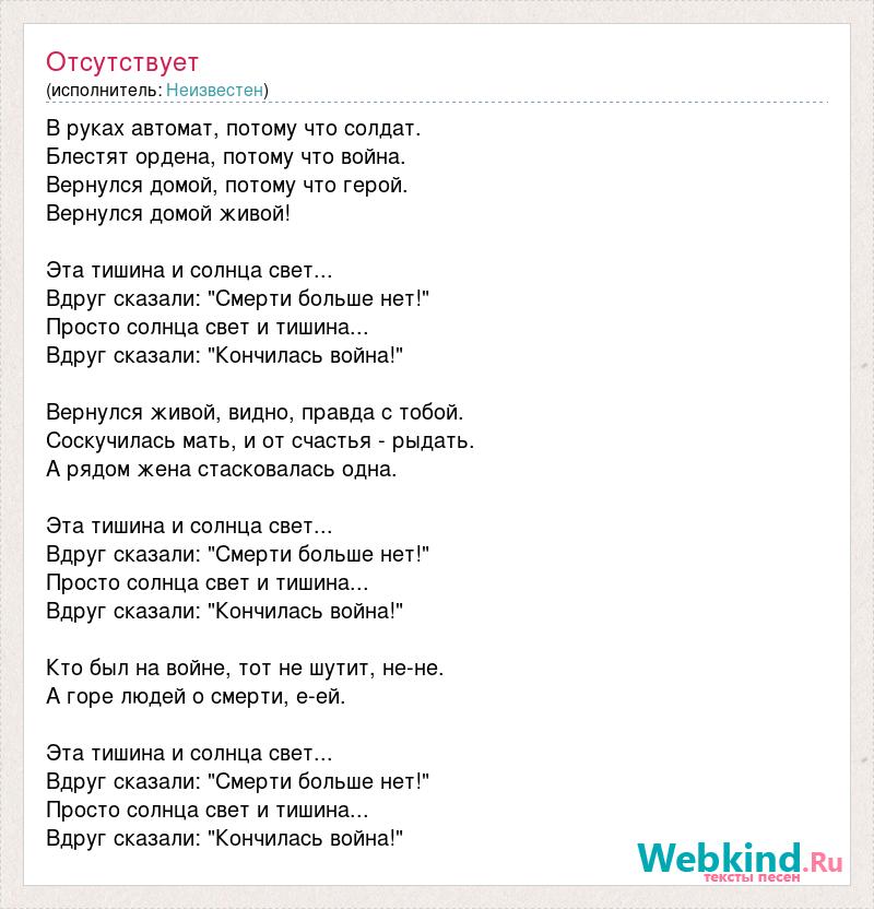 В руках автомат, потому что солдат. Блестят ордена, потому что война. Вернулся домой, потому что герой. Вернулся домой живой! Эта тишина и солнца свет... Вдруг сказали: "Смерти больше нет!" Просто солнца свет и тишина... Вдруг сказали: "Кончилась война!" Вернулся живой, видно, правда с тобой. Соскучилась мать, и от счастья - рыдать. А рядом жена стасковалась одна. Эта тишина и солнца свет... Вдруг сказали: "Смерти больше нет!" Просто солнца свет и тишина... Вдруг сказали: "Кончилась война!" Кто был на войне, тот не шутит, не-не. А горе людей о смерти, е-ей. Эта тишина и солнца свет... Вдруг сказали: "Смерти больше нет!" Просто солнца свет и тишина... Вдруг сказали: "Кончилась война!"