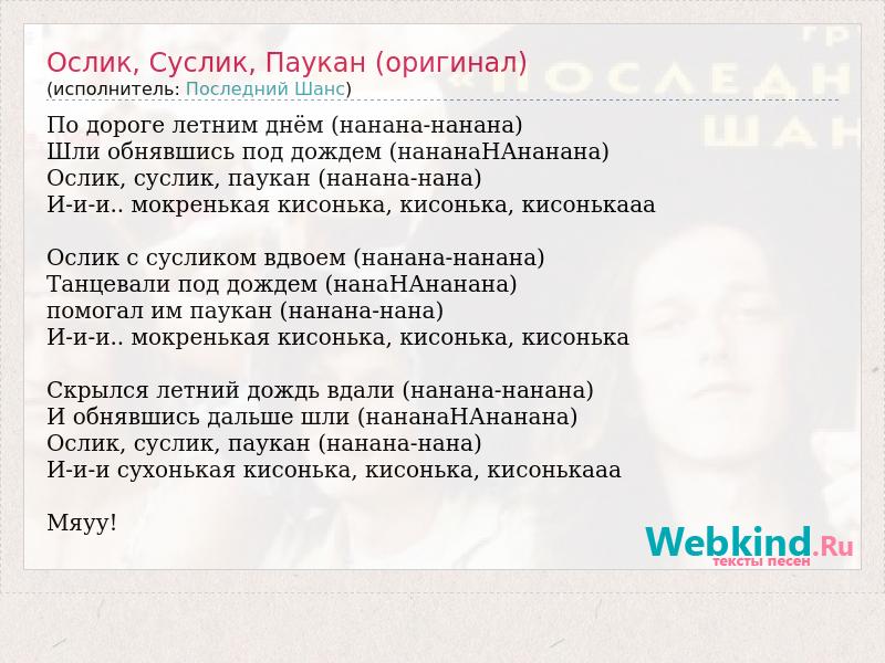 По дороге летним днём (нанана-нанана) Шли обнявшись под дождем (нананаНАнанана) Ослик, суслик, паукан (нанана-нана) И-и-и.. мокренькая кисонька, кисонька, кисонькааа Ослик с сусликом вдвоем (нанана-нанана) Танцевали под дождем (нанаНАнанана) помогал им паукан (нанана-нана) И-и-и.. мокренькая кисонька, кисонька, кисонька Скрылся летний дождь вдали (нанана-нанана) И обнявшись дальше шли (нананаНАнанана) Ослик, суслик, паукан (нанана-нана) И-и-и сухонькая кисонька, кисонька, кисонькааа Мяуу!