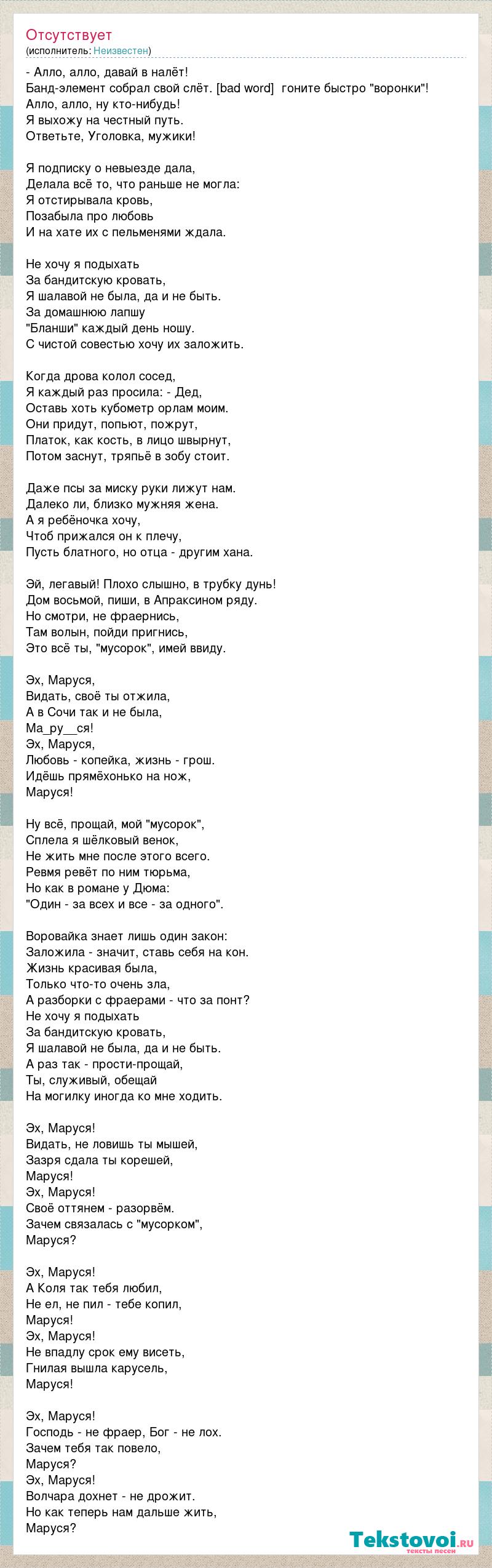 - Алло, алло, давай в налёт! Банд-элемент собрал свой слёт. [bad word] гоните быстро "воронки"! Алло, алло, ну кто-нибудь! Я выхожу на честный путь. Ответьте, Уголовка, мужики! Я подписку о невыезде дала, Делала всё то, что раньше не могла: Я отстирывала кровь, Позабыла про любовь И на хате их с пельменями ждала. Не хочу я подыхать За бандитскую кровать, Я шалавой не была, да и не быть. За домашнюю лапшу "Бланши" каждый день ношу. С чистой совестью хочу их заложить. Когда дрова колол сосед, Я каждый раз просила: - Дед, Оставь хоть кубометр орлам моим. Они придут, попьют, пожрут, Платок, как кость, в лицо швырнут, Потом заснут, тряпьё в зобу стоит. Даже псы за миску руки лижут нам. Далеко ли, близко мужняя жена. А я ребёночка хочу, Чтоб прижался он к плечу, Пусть блатного, но отца - другим хана. Эй, легавый! Плохо слышно, в трубку дунь! Дом восьмой, пиши, в Апраксином ряду. Но смотри, не фраернись, Там волын, пойди пригнись, Это всё ты, "мусорок", имей ввиду. Эх, Маруся, Видать, своё ты отжила, А в Сочи так и не была, Ма_ру__ся! Эх, Маруся, Любовь - копейка, жизнь - грош. Идёшь прямёхонько на нож, Маруся! Ну всё, прощай, мой "мусорок", Сплела я шёлковый венок, Не жить мне после этого всего. Ревмя ревёт по ним тюрьма, Но как в романе у Дюма: "Один - за всех и все - за одного". Воровайка знает лишь один закон: Заложила - значит, ставь себя на кон. Жизнь красивая была, Только что-то очень зла, А разборки с фраерами - что за понт? Не хочу я подыхать За бандитскую кровать, Я шалавой не была, да и не быть. А раз так - прости-прощай, Ты, служивый, обещай На могилку иногда ко мне ходить. Эх, Маруся! Видать, не ловишь ты мышей, Зазря сдала ты корешей, Маруся! Эх, Маруся! Своё оттянем - разорвём. Зачем связалась с "мусорком", Маруся? Эх, Маруся! А Коля так тебя любил, Не ел, не пил - тебе копил, Маруся! Эх, Маруся! Не впадлу срок ему висеть, Гнилая вышла карусель, Маруся! Эх, Маруся! Господь - не фраер, Бог - не лох. Зачем тебя так повело, Маруся? Эх, Маруся! Волчара дохнет - не дрожит. Но как теперь нам дальше жить, Маруся?