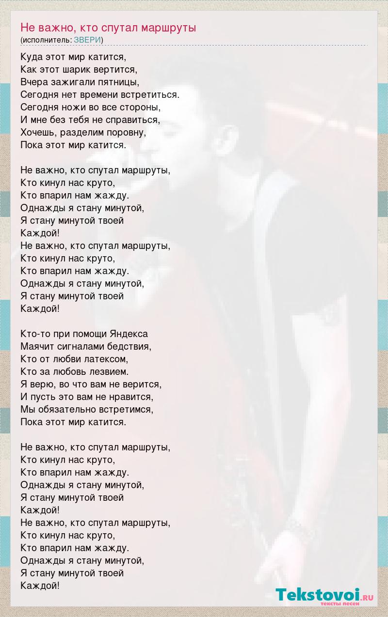 Куда этот мир катится, Как этот шарик вертится, Вчера зажигали пятницы, Сегодня нет времени встретиться. Сегодня ножи во все стороны, И мне без тебя не справиться, Хочешь, разделим поровну, Пока этот мир катится. Не важно, кто спутал маршруты, Кто кинул нас круто, Кто впарил нам жажду. Однажды я стану минутой, Я стану минутой твоей Каждой! Не важно, кто спутал маршруты, Кто кинул нас круто, Кто впарил нам жажду. Однажды я стану минутой, Я стану минутой твоей Каждой! Кто-то при помощи Яндекса Маячит сигналами бедствия, Кто от любви латексом, Кто за любовь лезвием. Я верю, во что вам не верится, И пусть это вам не нравится, Мы обязательно встретимся, Пока этот мир катится. Не важно, кто спутал маршруты, Кто кинул нас круто, Кто впарил нам жажду. Однажды я стану минутой, Я стану минутой твоей Каждой! Не важно, кто спутал маршруты, Кто кинул нас круто, Кто впарил нам жажду. Однажды я стану минутой, Я стану минутой твоей Каждой!