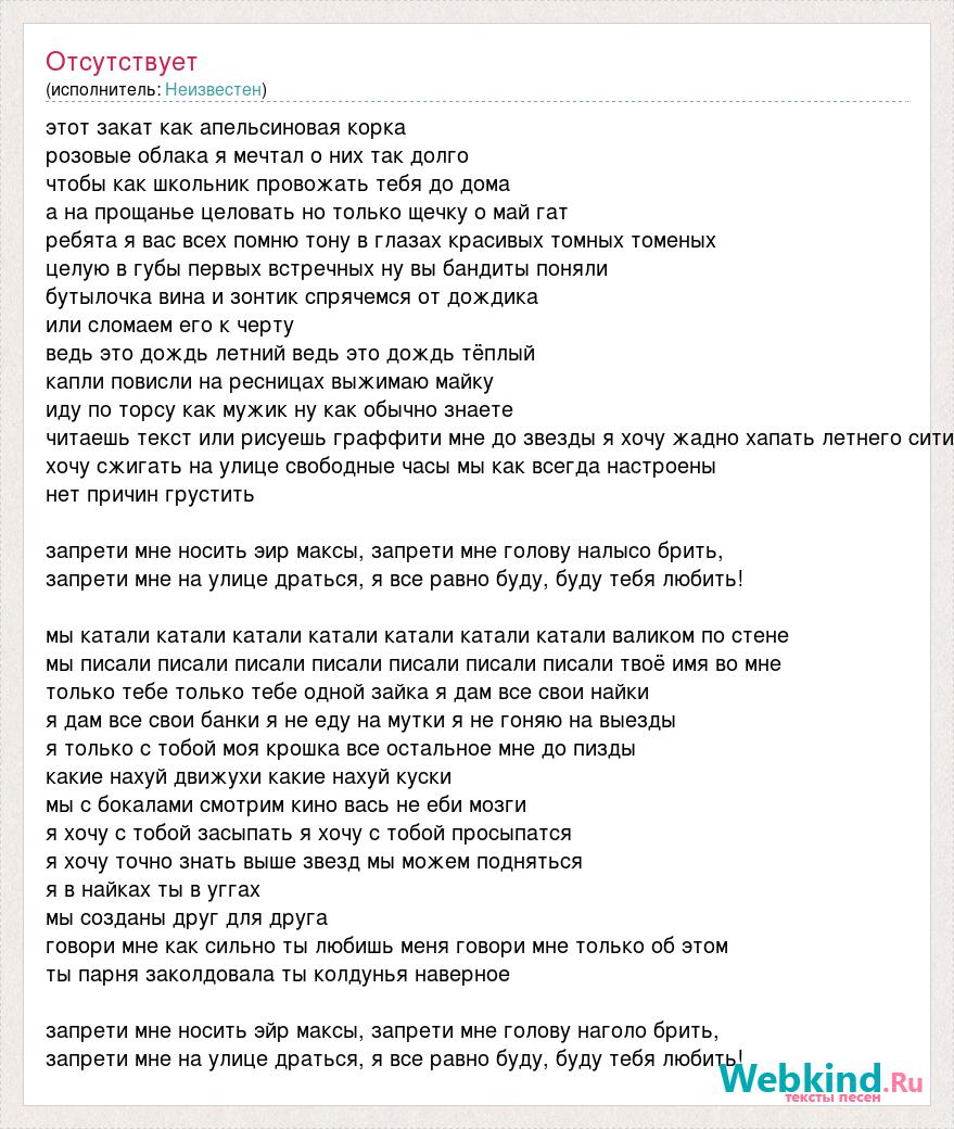 этот закат как апельсиновая корка розовые облака я мечтал о них так долго чтобы как школьник провожать тебя до дома а на прощанье целовать но только щечку о май гат ребята я вас всех помню тону в глазах красивых томных томеных целую в губы первых встречных ну вы бандиты поняли бутылочка вина и зонтик спрячемся от дождика или сломаем его к черту ведь это дождь летний ведь это дождь тёплый капли повисли на ресницах выжимаю майку иду по торсу как мужик ну как обычно знаете читаешь текст или рисуешь граффити мне до звезды я хочу жадно хапать летнего сити хочу сжигать на улице свободные часы мы как всегда настроены нет причин грустить запрети мне носить эир максы, запрети мне голову налысо брить, запрети мне на улице драться, я все равно буду, буду тебя любить! мы катали катали катали катали катали катали катали валиком по стене мы писали писали писали писали писали писали писали твоё имя во мне только тебе только тебе одной зайка я дам все свои найки я дам все свои банки я не еду на мутки я не гоняю на выезды я только с тобой моя крошка все остальное мне до пизды какие нахуй движухи какие нахуй куски мы с бокалами смотрим кино вась не еби мозги я хочу с тобой засыпать я хочу с тобой просыпатся я хочу точно знать выше звезд мы можем подняться я в найках ты в уггах мы созданы друг для друга говори мне как сильно ты любишь меня говори мне только об этом ты парня заколдовала ты колдунья наверное запрети мне носить эйр максы, запрети мне голову наголо брить, запрети мне на улице драться, я все равно буду, буду тебя любить!