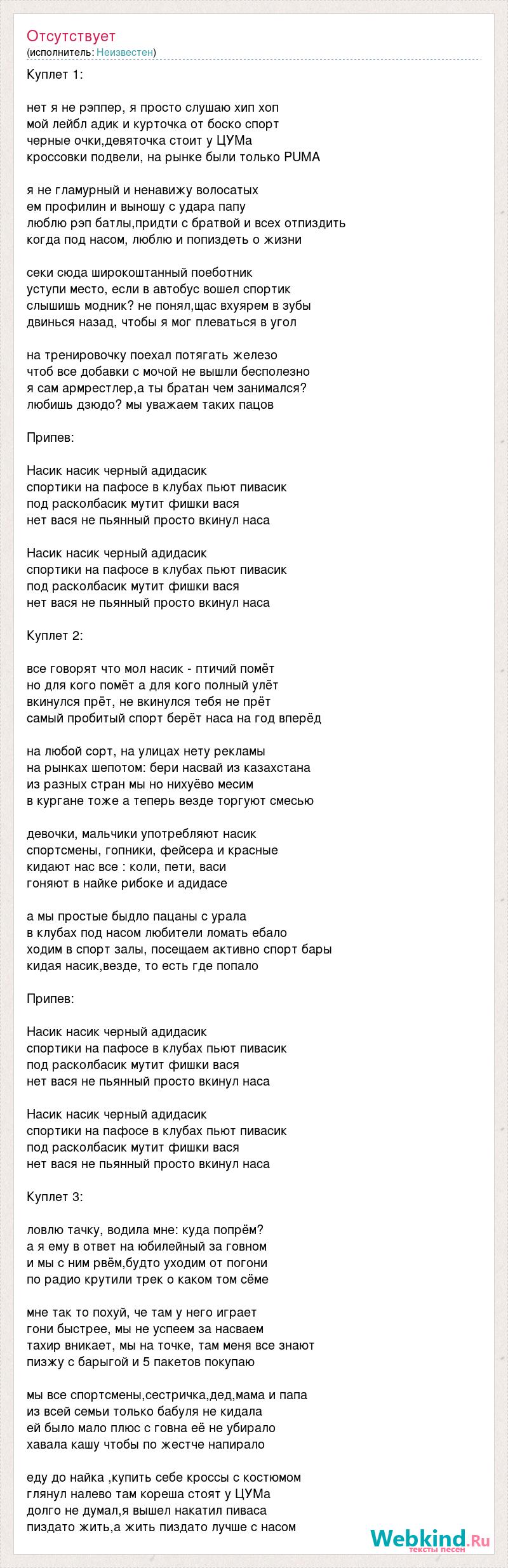 Куплет 1: нет я не рэппер, я просто слушаю хип хоп мой лейбл адик и курточка от боско спорт черные очки,девяточка стоит у ЦУМа кроссовки подвели, на рынке были только PUMA я не гламурный и ненавижу волосатых ем профилин и выношу с удара папу люблю рэп батлы,придти с братвой и всех отпиздить когда под насом, люблю и попиздеть о жизни секи сюда широкоштанный поеботник уступи место, если в автобус вошел спортик слышишь модник? не понял,щас вхуярем в зубы двинься назад, чтобы я мог плеваться в угол на тренировочку поехал потягать железо чтоб все добавки с мочой не вышли бесполезно я сам армрестлер,а ты братан чем занимался? любишь дзюдо? мы уважаем таких пацов Припев: Насик насик черный адидасик спортики на пафосе в клубах пьют пивасик под расколбасик мутит фишки вася нет вася не пьянный просто вкинул наса Насик насик черный адидасик спортики на пафосе в клубах пьют пивасик под расколбасик мутит фишки вася нет вася не пьянный просто вкинул наса Куплет 2: все говорят что мол насик - птичий помёт но для кого помёт а для кого полный улёт вкинулся прёт, не вкинулся тебя не прёт самый пробитый спорт берёт наса на год вперёд на любой сорт, на улицах нету рекламы на рынках шепотом: бери насвай из казахстана из разных стран мы но нихуёво месим в кургане тоже а теперь везде торгуют смесью девочки, мальчики употребляют насик спортсмены, гопники, фейсера и красные кидают нас все : коли, пети, васи гоняют в найке рибоке и адидасе а мы простые быдло пацаны с урала в клубах под насом любители ломать ебало ходим в спорт залы, посещаем активно спорт бары кидая насик,везде, то есть где попало Припев: Насик насик черный адидасик спортики на пафосе в клубах пьют пивасик под расколбасик мутит фишки вася нет вася не пьянный просто вкинул наса Насик насик черный адидасик спортики на пафосе в клубах пьют пивасик под расколбасик мутит фишки вася нет вася не пьянный просто вкинул наса Куплет 3: ловлю тачку, водила мне: куда попрём? а я ему в ответ на юбилейный за говном и мы с ним рвём,будто уходим от погони по радио крутили трек о каком том сёме мне так то похуй, че там у него играет гони быстрее, мы не успеем за насваем тахир вникает, мы на точке, там меня все знают пизжу с барыгой и 5 пакетов покупаю мы все спортсмены,сестричка,дед,мама и папа из всей семьи только бабуля не кидала ей было мало плюс с говна её не убирало хавала кашу чтобы по жестче напирало еду до найка ,купить себе кроссы с костюмом глянул налево там кореша стоят у ЦУМа долго не думал,я вышел накатил пиваса пиздато жить,а жить пиздато лучше с насом