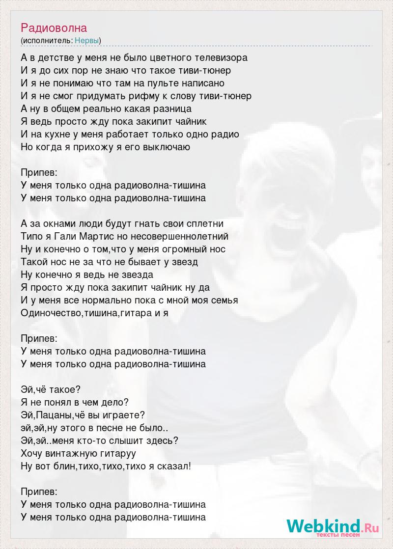 А в детстве у меня не было цветного телевизора И я до сих пор не знаю что такое тиви-тюнер И я не понимаю что там на пульте написано И я не смог придумать рифму к слову тиви-тюнер А ну в общем реально какая разница Я ведь просто жду пока закипит чайник И на кухне у меня работает только одно радио Но когда я прихожу я его выключаю Припев: У меня только одна радиоволна-тишина У меня только одна радиоволна-тишина А за окнами люди будут гнать свои сплетни Типо я Гали Мартис но несовершеннолетний Ну и конечно о том,что у меня огромный нос Такой нос не за что не бывает у звезд Ну конечно я ведь не звезда Я просто жду пока закипит чайник ну да И у меня все нормально пока с мной моя семья Одиночество,тишина,гитара и я Припев: У меня только одна радиоволна-тишина У меня только одна радиоволна-тишина Эй,чё такое? Я не понял в чем дело? Эй,Пацаны,чё вы играете? эй,эй,ну этого в песне не было.. Эй,эй..меня кто-то слышит здесь? Хочу винтажную гитаруу Ну вот блин,тихо,тихо,тихо я сказал! Припев: У меня только одна радиоволна-тишина У меня только одна радиоволна-тишина
