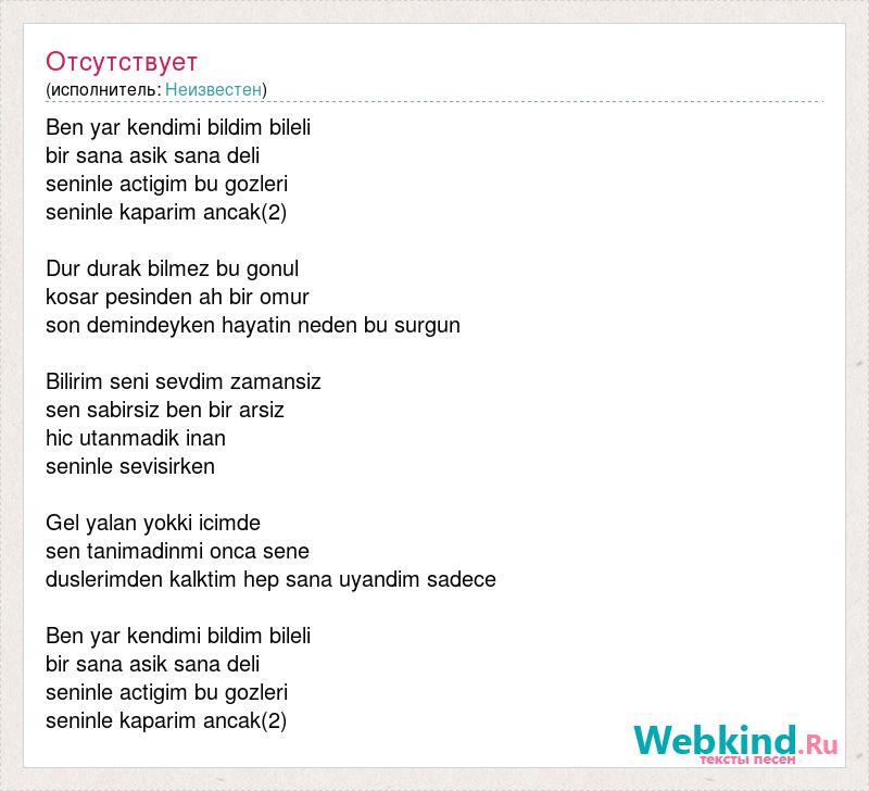Ben yar kendimi bildim bileli bir sana asik sana deli seninle actigim bu gozleri seninle kaparim ancak(2) Dur durak bilmez bu gonul kosar pesinden ah bir omur son demindeyken hayatin neden bu surgun Bilirim seni sevdim zamansiz sen sabirsiz ben bir arsiz hic utanmadik inan seninle sevisirken Gel yalan yokki icimde sen tanimadinmi onca sene duslerimden kalktim hep sana uyandim sadece Ben yar kendimi bildim bileli bir sana asik sana deli seninle actigim bu gozleri seninle kaparim ancak(2)