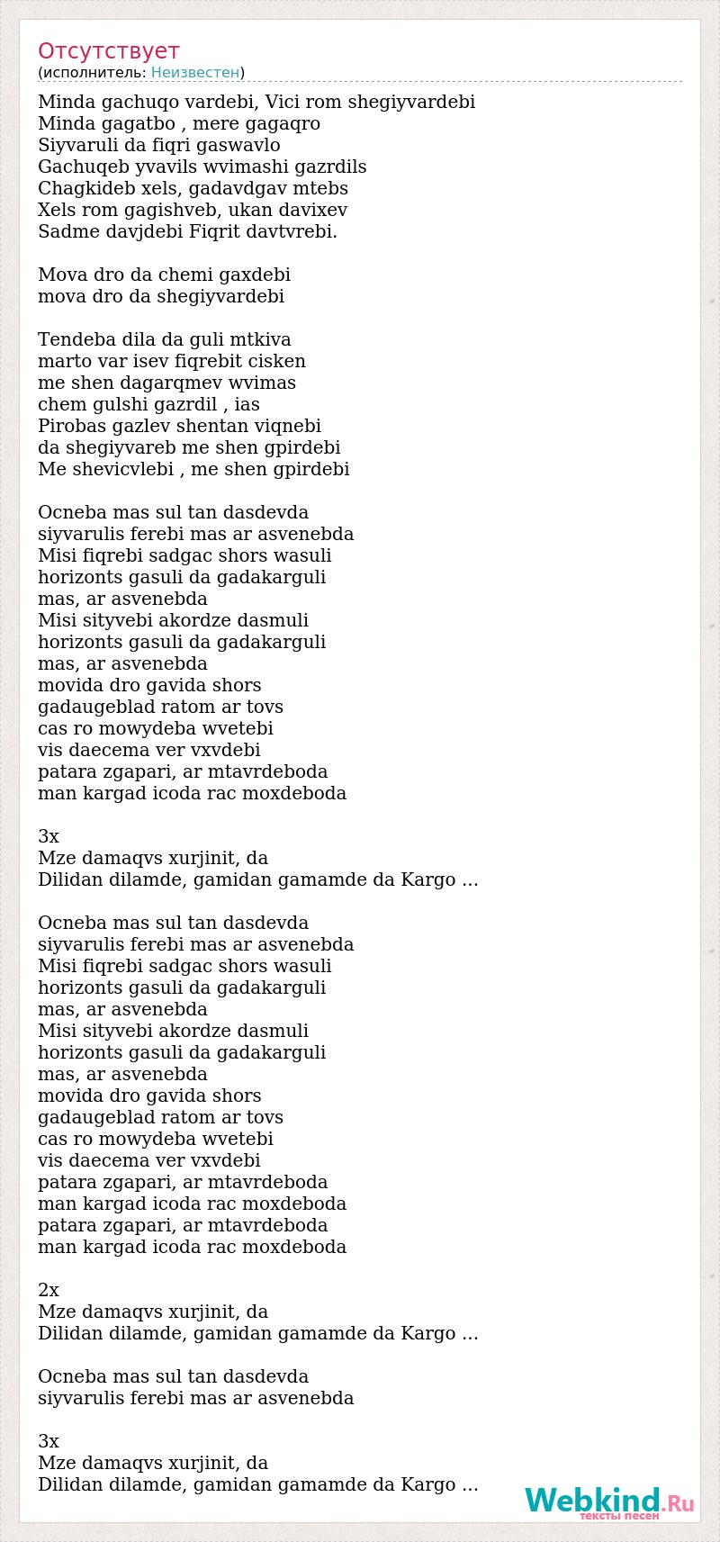 Minda gachuqo vardebi, Vici rom shegiyvardebi Minda gagatbo , mere gagaqro Siyvaruli da fiqri gaswavlo Gachuqeb yvavils wvimashi gazrdils Chagkideb xels, gadavdgav mtebs Xels rom gagishveb, ukan davixev Sadme davjdebi Fiqrit davtvrebi. Mova dro da chemi gaxdebi mova dro da shegiyvardebi Tendeba dila da guli mtkiva marto var isev fiqrebit cisken me shen dagarqmev wvimas chem gulshi gazrdil , ias Pirobas gazlev shentan viqnebi da shegiyvareb me shen gpirdebi Me shevicvlebi , me shen gpirdebi Ocneba mas sul tan dasdevda siyvarulis ferebi mas ar asvenebda Misi fiqrebi sadgac shors wasuli horizonts gasuli da gadakarguli mas, ar asvenebda Misi sityvebi akordze dasmuli horizonts gasuli da gadakarguli mas, ar asvenebda movida dro gavida shors gadaugeblad ratom ar tovs cas ro mowydeba wvetebi vis daecema ver vxvdebi patara zgapari, ar mtavrdeboda man kargad icoda rac moxdeboda 3x Mze damaqvs xurjinit, da Dilidan dilamde, gamidan gamamde da Kargo ... Ocneba mas sul tan dasdevda siyvarulis ferebi mas ar asvenebda Misi fiqrebi sadgac shors wasuli horizonts gasuli da gadakarguli mas, ar asvenebda Misi sityvebi akordze dasmuli horizonts gasuli da gadakarguli mas, ar asvenebda movida dro gavida shors gadaugeblad ratom ar tovs cas ro mowydeba wvetebi vis daecema ver vxvdebi patara zgapari, ar mtavrdeboda man kargad icoda rac moxdeboda patara zgapari, ar mtavrdeboda man kargad icoda rac moxdeboda 2x Mze damaqvs xurjinit, da Dilidan dilamde, gamidan gamamde da Kargo ... Ocneba mas sul tan dasdevda siyvarulis ferebi mas ar asvenebda 3x Mze damaqvs xurjinit, da Dilidan dilamde, gamidan gamamde da Kargo ...
