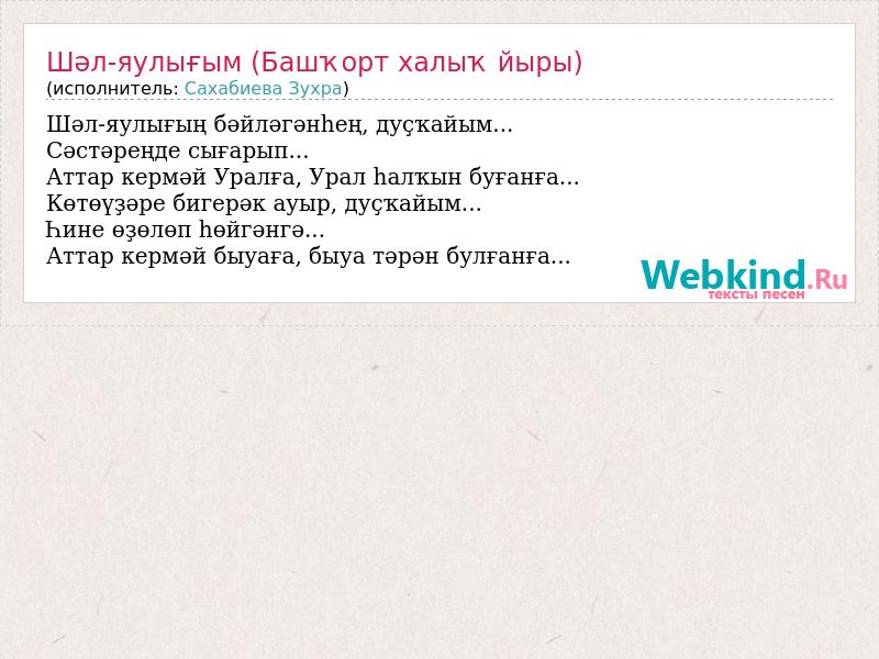 Шәл-яулығың бәйләгәнһең, дуҫҡайым... Сәстәреңде сығарып... Аттар кермәй Уралға, Урал һалҡын буғанға... Көтөүҙәре бигерәк ауыр, дуҫҡайым... Һине өҙөлөп һөйгәнгә... Аттар кермәй быуаға, быуа тәрән булғанға...