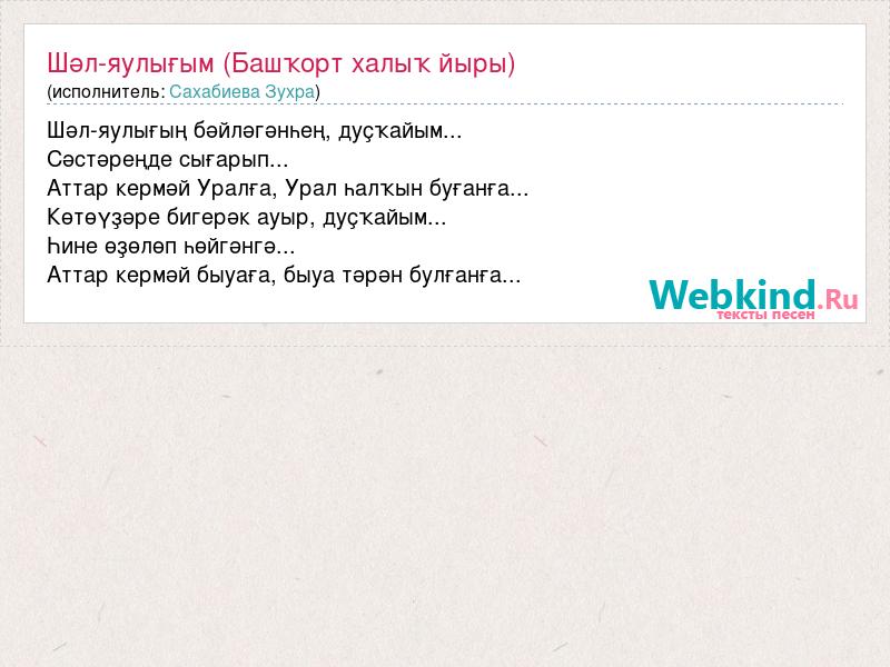 Шәл-яулығың бәйләгәнһең, дуҫҡайым... Сәстәреңде сығарып... Аттар кермәй Уралға, Урал һалҡын буғанға... Көтөүҙәре бигерәк ауыр, дуҫҡайым... Һине өҙөлөп һөйгәнгә... Аттар кермәй быуаға, быуа тәрән булғанға...