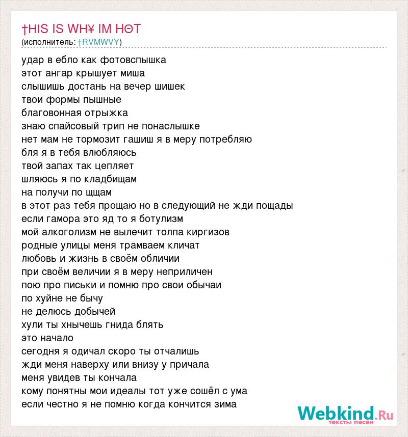 удар в ебло как фотовспышка этот ангар крышует миша слышишь достань на вечер шишек твои формы пышные благовонная отрыжка знаю спайсовый трип не понаслышке нет мам не тормозит гашиш я в меру потребляю бля я в тебя влюбляюсь твой запах так цепляет шляюсь я по кладбищам на получи по щщам в этот раз тебя прощаю но в следующий не жди пощады если гамора это яд то я ботулизм мой алкоголизм не вылечит толпа киргизов родные улицы меня трамваем кличат любовь и жизнь в своём обличии при своём величии я в меру неприличен пою про письки и помню про свои обычаи по хуйне не бычу не делюсь добычей хули ты хнычешь гнида блять это начало сегодня я одичал скоро ты отчалишь жди меня наверху или внизу у причала меня увидев ты кончала кому понятны мои идеалы тот уже сошёл с ума если честно я не помню когда кончится зима