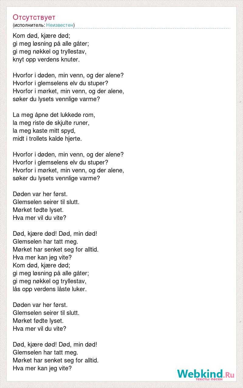 Kom død, kjære død; gi meg løsning på alle gåter; gi meg nøkkel og tryllestav, knyt opp verdens knuter. Hvorfor i døden, min venn, og der alene? Hvorfor i glemselens elv du stuper? Hvorfor i mørket, min venn, og der alene, søker du lysets vennlige varme? La meg åpne det lukkede rom, la meg riste de skjulte runer, la meg kaste mitt spyd, midt i trollets kalde hjerte. Hvorfor i døden, min venn, og der alene? Hvorfor i glemselens elv du stuper? Hvorfor i mørket, min venn, og der alene, søker du lysets vennlige varme? Døden var her først. Glemselen seirer til slutt. Mørket fødte lyset. Hva mer vil du vite? Død, kjære død! Død, min død! Glemselen har tatt meg. Mørket har senket seg for alltid. Hva mer kan jeg vite? Kom død, kjære død; gi meg løsning på alle gåter; gi meg nøkkel og tryllestav, lås opp verdens låste luker. Døden var her først. Glemselen seirer til slutt. Mørket fødte lyset. Hva mer vil du vite? Død, kjære død! Død, min død! Glemselen har tatt meg. Mørket har senket seg for alltid. Hva mer kan jeg vite?