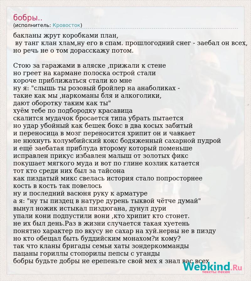 бакланы жрут коробками план, ву танг клан хлам,нy его в спам. прошлогодний снег - заебал он всех, но речь не о том дорасскажу потом. Стою за гаражами в аляске ,прижали к стене но греет на кармане полоска острой стали короче приближаться стали ко мне ну я: "слышь ты розовый бройлер на анаболиках - такие как мы ,наркоманы бля и алкоголики, дают оборотку таким как ты" хуём тебе по подбородку красавица скалится мудачок бросается типа убрать пытается но удар убойный как бешек бокс в два косых забитый и переносица в мозг переносится хрипит он и чавкает не нюхнуть колумбийский кокс бодяженный сахарной пудрой и ещё заебатая приблуда второму который поменьше исправлен прикус избавлен малыш от золотых фикс покушает мягкого муда и вот по глине козлик катается тот кто среди них был за тайсона как пиздатый микс свелась история стало попросторнее кость в кость так повелось ну и последний васюня руку к арматуре а я: "ну ты пиздец в натуре дурень тыквой чётче думай" вынул ножик истыкал пиздюгана, дунул дури упали кони подпустили вони ,кто хрипит кто стонет. не их был день.Раз в жизни случается такая хуетень понятно характер по вкусу не сахар на хуй.нервы не в пизду но кто обещал быть буддийским монахом?и кому? так что кланы бригады семьи хаты зондеркомманды пацаны гориллы стопорилы пепсы с уганды бобры будьте добры не ерепеньте свой мех я знал вас всех