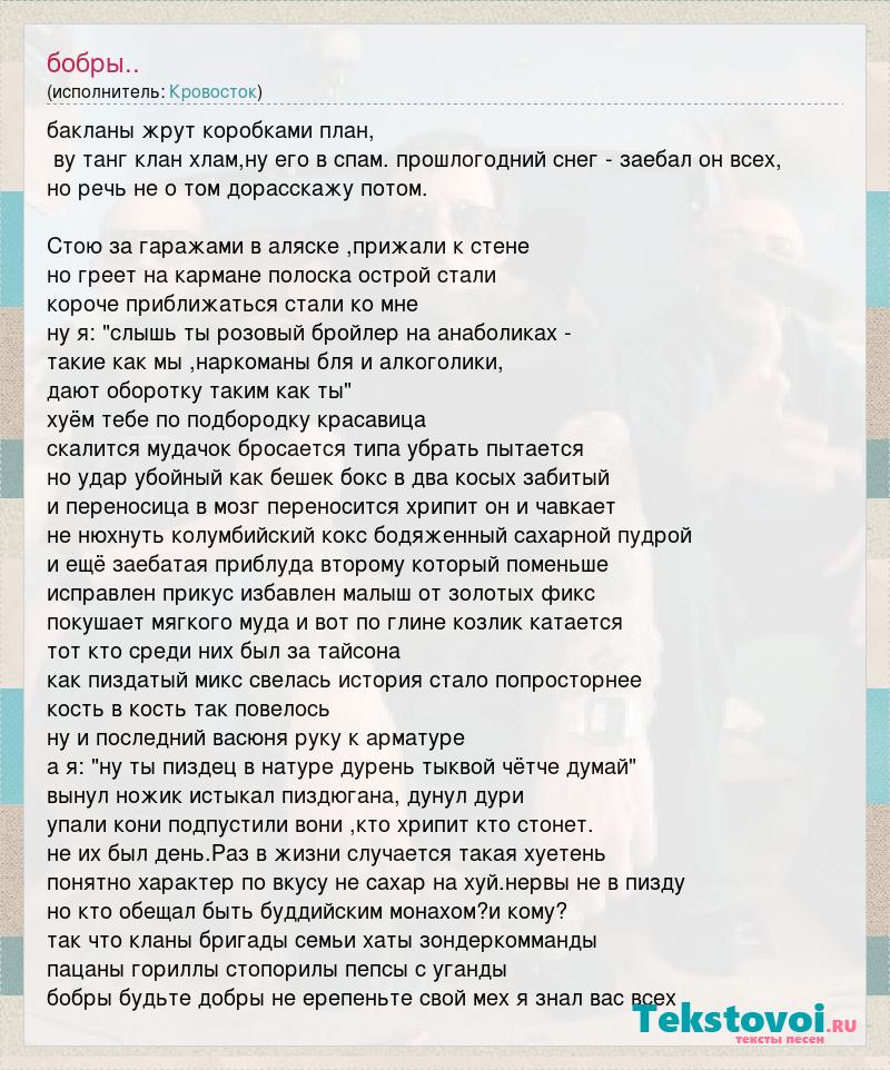 бакланы жрут коробками план, ву танг клан хлам,нy его в спам. прошлогодний снег - заебал он всех, но речь не о том дорасскажу потом. Стою за гаражами в аляске ,прижали к стене но греет на кармане полоска острой стали короче приближаться стали ко мне ну я: "слышь ты розовый бройлер на анаболиках - такие как мы ,наркоманы бля и алкоголики, дают оборотку таким как ты" хуём тебе по подбородку красавица скалится мудачок бросается типа убрать пытается но удар убойный как бешек бокс в два косых забитый и переносица в мозг переносится хрипит он и чавкает не нюхнуть колумбийский кокс бодяженный сахарной пудрой и ещё заебатая приблуда второму который поменьше исправлен прикус избавлен малыш от золотых фикс покушает мягкого муда и вот по глине козлик катается тот кто среди них был за тайсона как пиздатый микс свелась история стало попросторнее кость в кость так повелось ну и последний васюня руку к арматуре а я: "ну ты пиздец в натуре дурень тыквой чётче думай" вынул ножик истыкал пиздюгана, дунул дури упали кони подпустили вони ,кто хрипит кто стонет. не их был день.Раз в жизни случается такая хуетень понятно характер по вкусу не сахар на хуй.нервы не в пизду но кто обещал быть буддийским монахом?и кому? так что кланы бригады семьи хаты зондеркомманды пацаны гориллы стопорилы пепсы с уганды бобры будьте добры не ерепеньте свой мех я знал вас всех