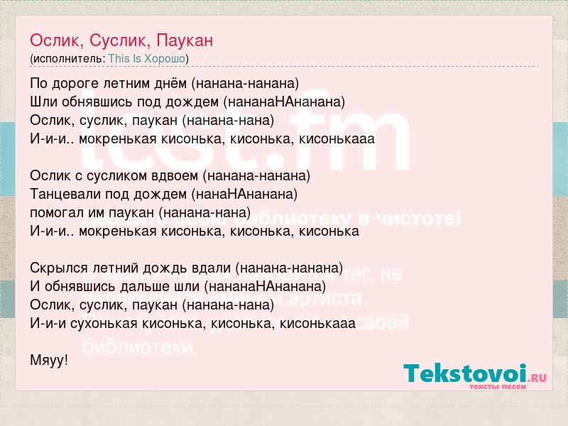По дороге летним днём (нанана-нанана) Шли обнявшись под дождем (нананаНАнанана) Ослик, суслик, паукан (нанана-нана) И-и-и.. мокренькая кисонька, кисонька, кисонькааа Ослик с сусликом вдвоем (нанана-нанана) Танцевали под дождем (нанаНАнанана) помогал им паукан (нанана-нана) И-и-и.. мокренькая кисонька, кисонька, кисонька Скрылся летний дождь вдали (нанана-нанана) И обнявшись дальше шли (нананаНАнанана) Ослик, суслик, паукан (нанана-нана) И-и-и сухонькая кисонька, кисонька, кисонькааа Мяуу!