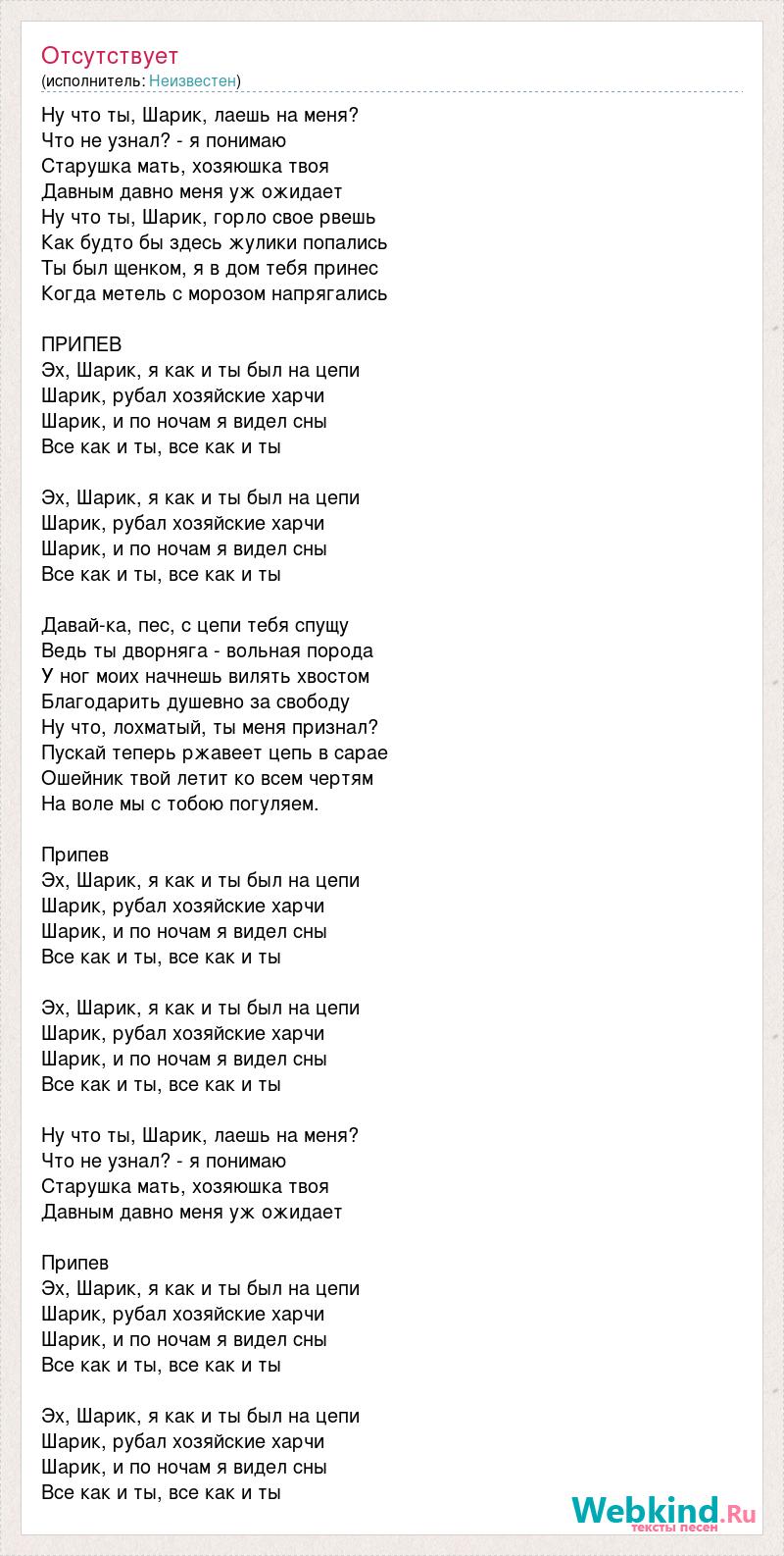 Ну что ты, Шарик, лаешь на меня? Что не узнал? - я понимаю Старушка мать, хозяюшка твоя Давным давно меня уж ожидает Ну что ты, Шарик, горло свое рвешь Как будто бы здесь жулики попались Ты был щенком, я в дом тебя принес Когда метель с морозом напрягались ПРИПЕВ Эх, Шарик, я как и ты был на цепи Шарик, рубал хозяйские харчи Шарик, и по ночам я видел сны Все как и ты, все как и ты Эх, Шарик, я как и ты был на цепи Шарик, рубал хозяйские харчи Шарик, и по ночам я видел сны Все как и ты, все как и ты Давай-ка, пес, с цепи тебя спущу Ведь ты дворняга - вольная порода У ног моих начнешь вилять хвостом Благодарить душевно за свободу Ну что, лохматый, ты меня признал? Пускай теперь ржавеет цепь в сарае Ошейник твой летит ко всем чертям На воле мы с тобою погуляем. Припев Эх, Шарик, я как и ты был на цепи Шарик, рубал хозяйские харчи Шарик, и по ночам я видел сны Все как и ты, все как и ты Эх, Шарик, я как и ты был на цепи Шарик, рубал хозяйские харчи Шарик, и по ночам я видел сны Все как и ты, все как и ты Ну что ты, Шарик, лаешь на меня? Что не узнал? - я понимаю Старушка мать, хозяюшка твоя Давным давно меня уж ожидает Припев Эх, Шарик, я как и ты был на цепи Шарик, рубал хозяйские харчи Шарик, и по ночам я видел сны Все как и ты, все как и ты Эх, Шарик, я как и ты был на цепи Шарик, рубал хозяйские харчи Шарик, и по ночам я видел сны Все как и ты, все как и ты