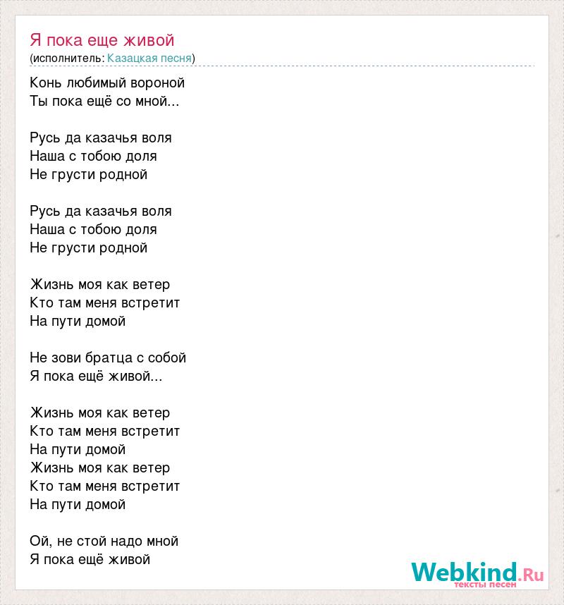 Конь любимый вороной Ты пока ещё со мной... Русь да казачья воля Наша с тобою доля Не грусти родной Русь да казачья воля Наша с тобою доля Не грусти родной Жизнь моя как ветер Кто там меня встретит На пути домой Не зови братца с собой Я пока ещё живой... Жизнь моя как ветер Кто там меня встретит На пути домой Жизнь моя как ветер Кто там меня встретит На пути домой Ой, не стой надо мной Я пока ещё живой
