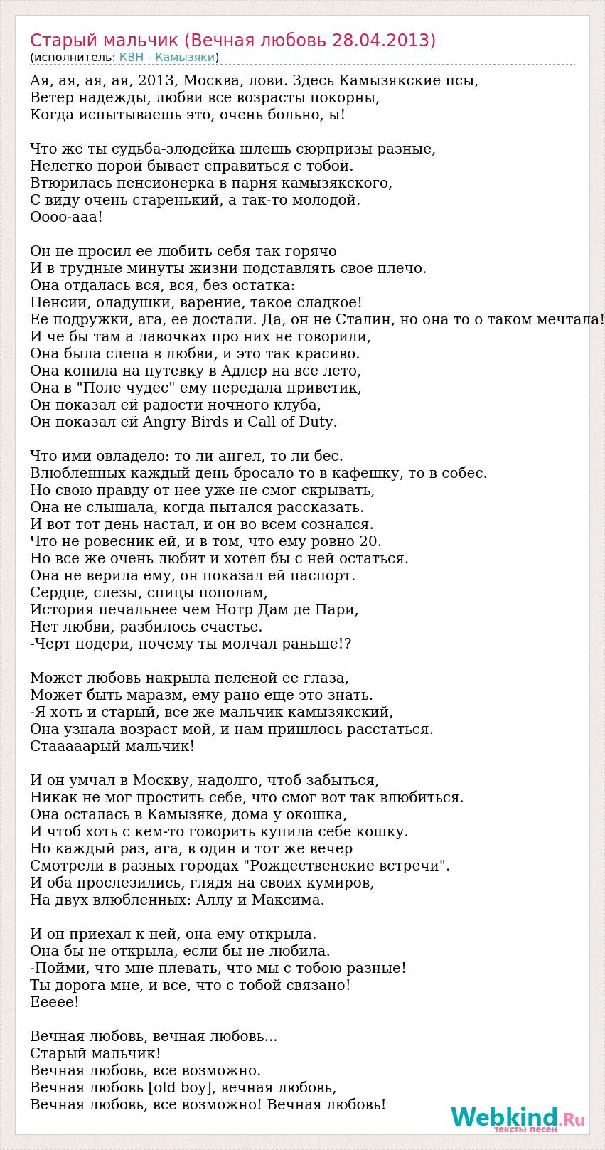 Ая, ая, ая, ая, 2013, Москва, лови. Здесь Камызякские псы, Ветер надежды, любви все возрасты покорны, Когда испытываешь это, очень больно, ы! Что же ты судьба-злодейка шлешь сюрпризы разные, Нелегко порой бывает справиться с тобой. Втюрилась пенсионерка в парня камызякского, С виду очень старенький, а так-то молодой. Оооо-ааа! Он не просил ее любить себя так горячо И в трудные минуты жизни подставлять свое плечо. Она отдалась вся, вся, без остатка: Пенсии, оладушки, варение, такое сладкое! Ее подружки, ага, ее достали. Да, он не Сталин, но она то о таком мечтала! И че бы там а лавочках про них не говорили, Она была слепа в любви, и это так красиво. Она копила на путевку в Адлер на все лето, Она в "Поле чудес" ему передала приветик, Он показал ей радости ночного клуба, Он показал ей Angry Birds и Call of Duty. Что ими овладело: то ли ангел, то ли бес. Влюбленных каждый день бросало то в кафешку, то в собес. Но свою правду от нее уже не смог скрывать, Она не слышала, когда пытался рассказать. И вот тот день настал, и он во всем сознался. Что не ровесник ей, и в том, что ему ровно 20. Но все же очень любит и хотел бы с ней остаться. Она не верила ему, он показал ей паспорт. Сердце, слезы, спицы пополам, История печальнее чем Нотр Дам де Пари, Нет любви, разбилось счастье. -Черт подери, почему ты молчал раньше!? Может любовь накрыла пеленой ее глаза, Может быть маразм, ему рано еще это знать. -Я хоть и старый, все же мальчик камызякский, Она узнала возраст мой, и нам пришлось расстаться. Стааааарый мальчик! И он умчал в Москву, надолго, чтоб забыться, Никак не мог простить себе, что смог вот так влюбиться. Она осталась в Камызяке, дома у окошка, И чтоб хоть с кем-то говорить купила себе кошку. Но каждый раз, ага, в один и тот же вечер Смотрели в разных городах "Рождественские встречи". И оба прослезились, глядя на своих кумиров, На двух влюбленных: Аллу и Максима. И он приехал к ней, она ему открыла. Она бы не открыла, если бы не любила. -Пойми, что мне плевать, что мы с тобою разные! Ты дорога мне, и все, что с тобой связано! Еееее! Вечная любовь, вечная любовь... Старый мальчик! Вечная любовь, все возможно. Вечная любовь [old boy], вечная любовь, Вечная любовь, все возможно! Вечная любовь!