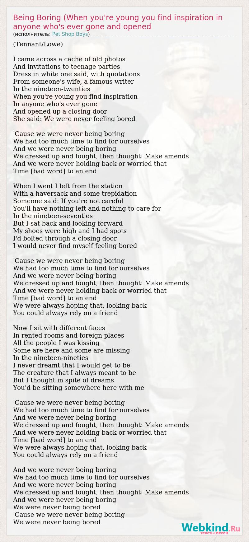 (Tennant/Lowe) I came across a cache of old photos And invitations to teenage parties Dress in white one said, with quotations From someone's wife, a famous writer In the nineteen-twenties When you're young you find inspiration In anyone who's ever gone And opened up a closing door She said: We were never feeling bored 'Cause we were never being boring We had too much time to find for ourselves And we were never being boring We dressed up and fought, then thought: Make amends And we were never holding back or worried that Time [bad word] to an end When I went I left from the station With a haversack and some trepidation Someone said: If you're not careful You'll have nothing left and nothing to care for In the nineteen-seventies But I sat back and looking forward My shoes were high and I had spots I'd bolted through a closing door I would never find myself feeling bored 'Cause we were never being boring We had too much time to find for ourselves And we were never being boring We dressed up and fought, then thought: Make amends And we were never holding back or worried that Time [bad word] to an end We were always hoping that, looking back You could always rely on a friend Now I sit with different faces In rented rooms and foreign places All the people I was kissing Some are here and some are missing In the nineteen-nineties I never dreamt that I would get to be The creature that I always meant to be But I thought in spite of dreams You'd be sitting somewhere here with me 'Cause we were never being boring We had too much time to find for ourselves And we were never being boring We dressed up and fought, then thought: Make amends And we were never holding back or worried that Time [bad word] to an end We were always hoping that, looking back You could always rely on a friend And we were never being boring We had too much time to find for ourselves And we were never being boring We dressed up and fought, then thought: Make amends And we were never being boring We were never being bored 'Cause we were never being boring We were never being bored