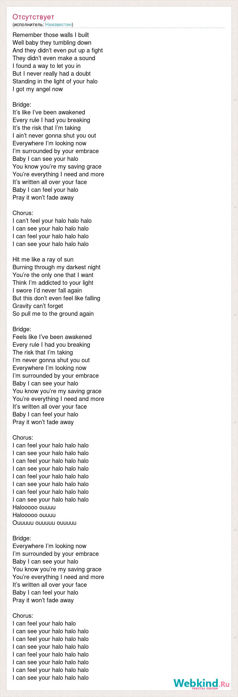 Remember those walls I built Well baby they tumbling down And they didn’t even put up a fight They didn’t even make a sound I found a way to let you in But I never really had a doubt Standing in the light of your halo I got my angel now Bridge: It’s like I’ve been awakened Every rule I had you breaking It’s the risk that I’m taking I ain’t never gonna shut you out Everywhere I’m looking now I’m surrounded by your embrace Baby I can see your halo You know you’re my saving grace You’re everything I need and more It’s written all over your face Baby I can feel your halo Pray it won’t fade away Chorus: I can’t feel your halo halo halo I can see your halo halo halo I can feel your halo halo halo I can see your halo halo halo Hit me like a ray of sun Burning through my darkest night You’re the only one that I want Think I’m addicted to your light I swore I’d never fall again But this don’t even feel like falling Gravity can’t forget So pull me to the ground again Bridge: Feels like I’ve been awakened Every rule I had you breaking The risk that I’m taking I’m never gonna shut you out Everywhere I’m looking now I’m surrounded by your embrace Baby I can see your halo You know you’re my saving grace You’re everything I need and more It’s written all over your face Baby I can feel your halo Pray it won’t fade away Chorus: I can feel your halo halo halo I can see your halo halo halo I can feel your halo halo halo I can see your halo halo halo I can feel your halo halo halo I can see your halo halo halo I can feel your halo halo halo I can see your halo halo halo Halooooo ouuuu Halooooo ouuuu Ouuuuu ouuuuu ouuuuu Bridge: Everywhere I’m looking now I’m surrounded by your embrace Baby I can see your halo You know you’re my saving grace You’re everything I need and more It’s written all over your face Baby I can feel your halo Pray it won’t fade away Chorus: I can feel your halo halo I can see your halo halo halo I can feel your halo halo halo I can see your halo halo halo I can feel your halo halo halo I can see your halo halo halo I can feel your halo halo halo I can see your halo halo halo