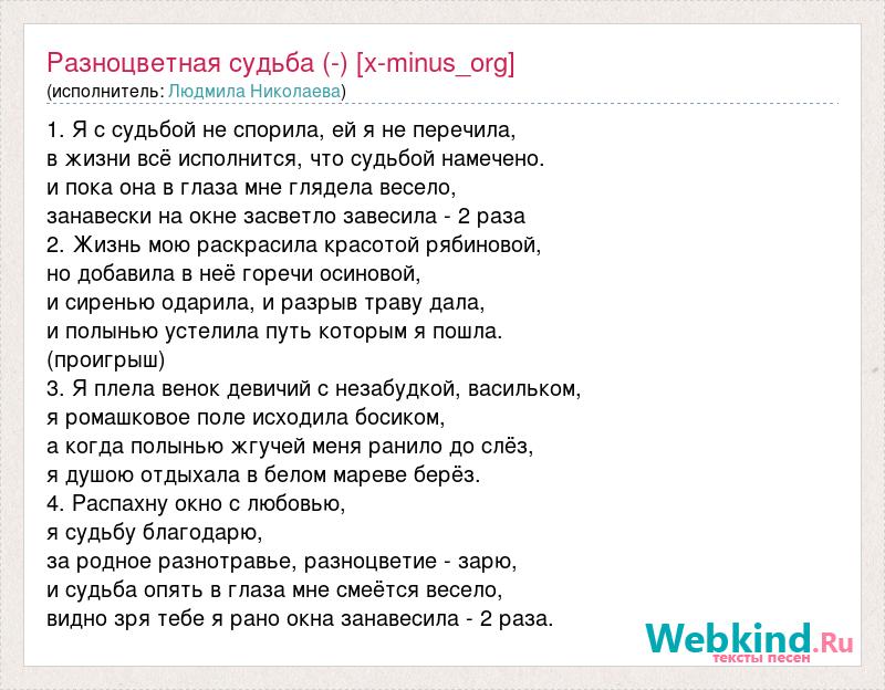 1. Я с судьбой не спорила, ей я не перечила, в жизни всё исполнится, что судьбой намечено. и пока она в глаза мне глядела весело, занавески на окне засветло завесила - 2 раза 2. Жизнь мою раскрасила красотой рябиновой, но добавила в неё горечи осиновой, и сиренью одарила, и разрыв траву дала, и полынью устелила путь которым я пошла. (проигрыш) 3. Я плела венок девичий с незабудкой, васильком, я ромашковое поле исходила босиком, а когда полынью жгучей меня ранило до слёз, я душою отдыхала в белом мареве берёз. 4. Распахну окно с любовью, я судьбу благодарю, за родное разнотравье, разноцветие - зарю, и судьба опять в глаза мне смеётся весело, видно зря тебе я рано окна занавесила - 2 раза.