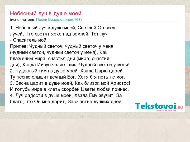 1. Небесный луч в душе моей, Светлей Он всех лучей, Что светят ярко над землей; Тот луч - Спаситель мой. Припев: Чудный светоч, чудный светоч у меня (чудный светоч, чудный светоч у меня), Как блаженны мира, счастья дни (мира, счастья дни), Когда Иисус являет лик. Чудный светоч у меня! 2. Чудесный гимн в душе моей: Хвала Царю царей. Ту песню слышит вечный Бог, Хотя б я петь не мог. 3. Весна царит в душе моей, Как близок мой Христос! И голубь мира в клеть скорбей Цветы любви принес. 4. Луч радости в душе моей, Хвала Ему звучит, За благо, что Он мне дарит, За счастье лучших дней.