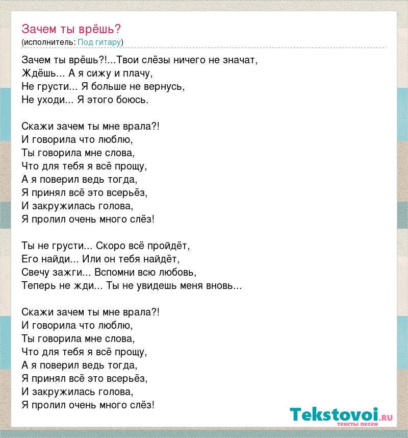 Зачем ты врёшь?!...Твои слёзы ничего не значат, Ждёшь... А я сижу и плачу, Не грусти... Я больше не вернусь, Не уходи... Я этого боюсь. Скажи зачем ты мне врала?! И говорила что люблю, Ты говорила мне слова, Что для тебя я всё прощу, А я поверил ведь тогда, Я принял всё это всерьёз, И закружилась голова, Я пролил очень много слёз! Ты не грусти... Скоро всё пройдёт, Его найди... Или он тебя найдёт, Свечу зажги... Вспомни всю любовь, Теперь не жди... Ты не увидешь меня вновь... Скажи зачем ты мне врала?! И говорила что люблю, Ты говорила мне слова, Что для тебя я всё прощу, А я поверил ведь тогда, Я принял всё это всерьёз, И закружилась голова, Я пролил очень много слёз!
