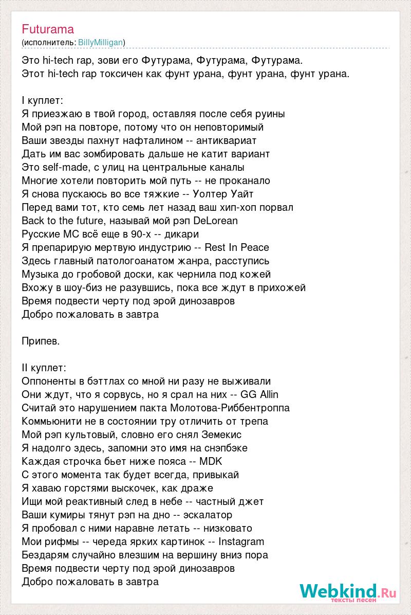 Это hi-tech rap, зови его Футурама, Футурама, Футурама. Этот hi-tech rap токсичен как фунт урана, фунт урана, фунт урана. I куплет: Я приезжаю в твой город, оставляя после себя руины Мой рэп на повторе, потому что он неповторимый Ваши звезды пахнут нафталином -- антиквариат Дать им вас зомбировать дальше не катит вариант Это self-made, с улиц на центральные каналы Многие хотели повторить мой путь -- не проканало Я снова пускаюсь во все тяжкие -- Уолтер Уайт Перед вами тот, кто семь лет назад ваш хип-хоп порвал Back to the future, называй мой рэп DeLorean Русские MC всё еще в 90-х -- дикари Я препарирую мертвую индустрию -- Rest In Peace Здесь главный патологоанатом жанра, расступись Музыка до гробовой доски, как чернила под кожей Вхожу в шоу-биз не разувшись, пока все ждут в прихожей Время подвести черту под эрой динозавров Добро пожаловать в завтра Припев. II куплет: Оппоненты в бэттлах со мной ни разу не выживали Они ждут, что я сорвусь, но я срал на них -- GG Allin Считай это нарушением пакта Молотова-Риббентроппа Коммьюнити не в состоянии тру отличить от трепа Мой рэп культовый, словно его снял Земекис Я надолго здесь, запомни это имя на снэпбэке Каждая строчка бьет ниже пояса -- MDK С этого момента так будет всегда, привыкай Я хаваю горстями выскочек, как драже Ищи мой реактивный след в небе -- частный джет Ваши кумиры тянут рэп на дно -- эскалатор Я пробовал с ними наравне летать -- низковато Мои рифмы -- череда ярких картинок -- Instagram Бездарям случайно влезшим на вершину вниз пора Время подвести черту под эрой динозавров Добро пожаловать в завтра