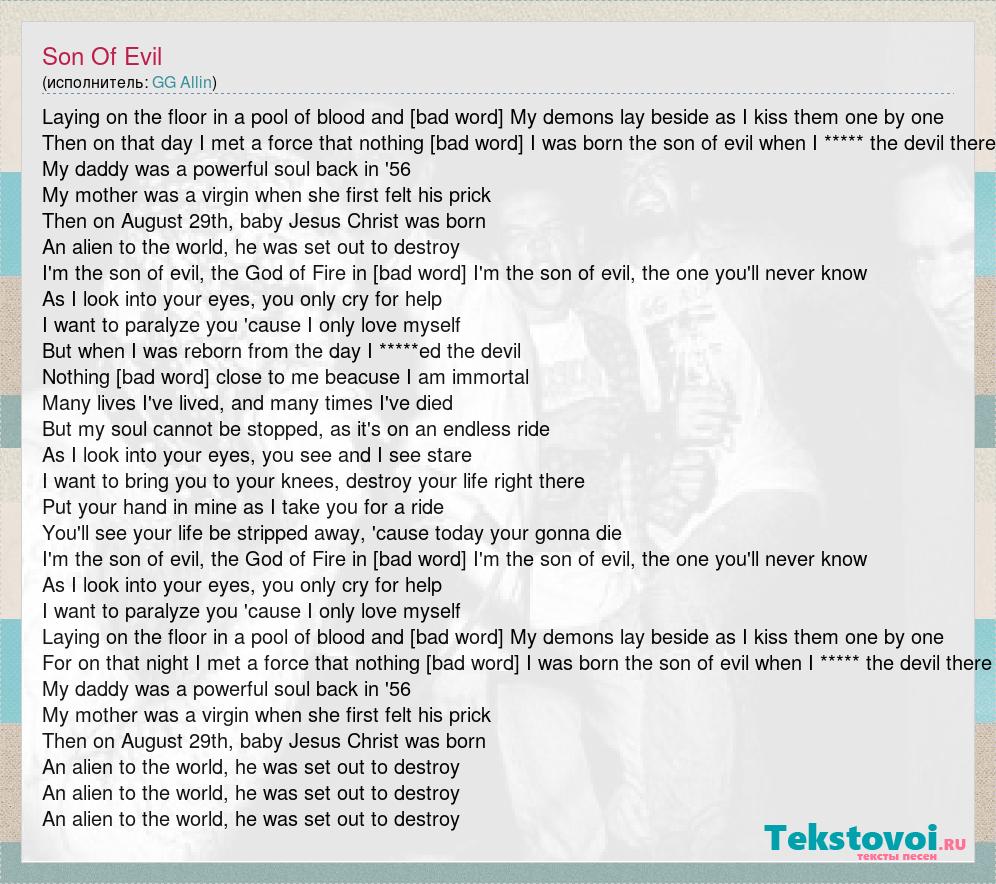 Laying on the floor in a pool of blood and [bad word] My demons lay beside as I kiss them one by one Then on that day I met a force that nothing will compare I was born the son of evil when I ***** the devil there My daddy was a powerful soul back in '56 My mother was a virgin when she first felt his prick Then on August 29th, baby Jesus Christ was born An alien to the world, he was set out to destroy I'm the son of evil, the God of Fire in Hell I'm the son of evil, the one you'll never know As I look into your eyes, you only cry for help I want to paralyze you 'cause I only love myself But when I was reborn from the day I *****ed the devil Nothing will come close to me beacuse I am immortal Many lives I've lived, and many times I've died But my soul cannot be stopped, as it's on an endless ride As I look into your eyes, you see and I see stare I want to bring you to your knees, destroy your life right there Put your hand in mine as I take you for a ride You'll see your life be stripped away, 'cause today your gonna die I'm the son of evil, the God of Fire in Hell I'm the son of evil, the one you'll never know As I look into your eyes, you only cry for help I want to paralyze you 'cause I only love myself Laying on the floor in a pool of blood and [bad word] My demons lay beside as I kiss them one by one For on that night I met a force that nothing will compare I was born the son of evil when I ***** the devil there My daddy was a powerful soul back in '56 My mother was a virgin when she first felt his prick Then on August 29th, baby Jesus Christ was born An alien to the world, he was set out to destroy An alien to the world, he was set out to destroy An alien to the world, he was set out to destroy