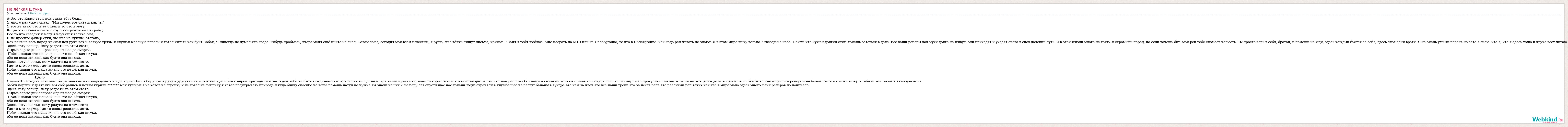 А-Вот это Класс веди мои стихи ебут беды, Я много раз уже слыхал: "Мы хочем все читать как ты" Я всё не знаю что я за чувак и то что я могу, Когда я начинал читать то русский реп лежал в гробу, Всё то что сегодня я могу я научился только сам, И не просите фичер суки, вы мне не нужны, отстань, Как раньше весь народ кричал под руки век и всякую грязь, я слушал Красную плесен и хотел читать как бунт Собак, Я никогда не думал что когда- нибудь пробьюсь, вчера меня ещё никто не знал, Солам союз, сегодня мои всем известны, я рулю, мне тёлки пишут письма, кричат - "Саня я тебя люблю". Мне насрать на МТВ или на Underground, те кто в Underground как надо реп читать не знают. Я в этом мире вижу только 2 звезды на небе. Пойми что нужен долгий стих- хочешь остаться в деле. Все ваши реперы как мухи долго не живут- они приходят и уходят снова в снов далекий путь. Я в этой жизни много не хочю- я скромный перец, но если хочешь бит- мой реп тебе сломает челюсть. Ты просто верь в себя, братан, и помощи не жди, здесь каждый бьется за себя, здесь слог одни враги. Я не очень умный парень но зато я знаю- кто я, что я здесь хочю и круче всех читаю. Здесь нету солнца, нету радости на этом свете, Сырые серые дни сопровождают нас до смерти. Пойми пацан что наша жизнь это не лёгкая штука, еби ее пока живешь как будто она шлюха. Здесь нету счастья, нету радуги на этом свете, Где-то кто-то умер,где-то снова родились дети. Пойми пацан что наша жизнь это не лёгкая штука, еби ее пока живешь как будто она шлюха. _________________ЦАРЬ_______________________ Стакан 100г водки закатают бит я знаю чё мне надо делать когда играет бит я беру хуй в руку в другую микрафон выходите бич с царём приходит мы вас ждём,тебе не быть важдём-нет смотри горит ваш дом-смотри наша музыка взрывает и горит огнём это вам говорит о том что мой реп стал большим и сильным хотя он с малых лет курил гашиш и спирт пил,прогуливал школу и хотел читать реп и делать треки хотел бы-быть самым лучшем репером на белом свете в голове ветер в табили жестоком но каждой ночи бабки партии и девяёнке мы соберались и понты курили ******* мои кумиры я не хотел на стройку и не хотел на фабрику я хотел подыгрывать природе и куда блику спасибо но ваша помощь нахуй не нужна вы знали наших 2 мс пару лет спустя щас нас узнали люди охраняли в клумбе щас не растут бананы в тундре это нам за член это все наши треки это за честь репа это реальный реп таких как нас в мире мало здесь много фейк реперов из понциало. Здесь нету солнца, нету радости на этом свете, Сырые серые дни сопровождают нас до смерти. Пойми пацан что наша жизнь это не лёгкая штука, еби ее пока живешь как будто она шлюха. Здесь нету счастья, нету радуги на этом свете, Где-то кто-то умер,где-то снова родились дети. Пойми пацан что наша жизнь это не лёгкая штука, еби ее пока живешь как будто она шлюха.