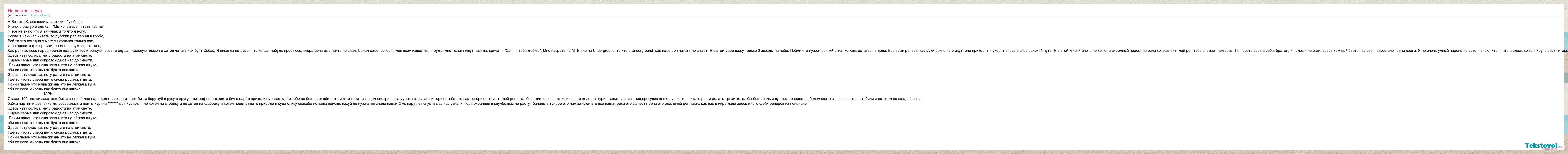 А-Вот это Класс веди мои стихи ебут беды, Я много раз уже слыхал: "Мы хочем все читать как ты" Я всё не знаю что я за чувак и то что я могу, Когда я начинал читать то русский реп лежал в гробу, Всё то что сегодня я могу я научился только сам, И не просите фичер суки, вы мне не нужны, отстань, Как раньше весь народ кричал под руки век и всякую грязь, я слушал Красную плесен и хотел читать как бунт Собак, Я никогда не думал что когда- нибудь пробьюсь, вчера меня ещё никто не знал, Солам союз, сегодня мои всем известны, я рулю, мне тёлки пишут письма, кричат - "Саня я тебя люблю". Мне насрать на МТВ или на Underground, те кто в Underground как надо реп читать не знают. Я в этом мире вижу только 2 звезды на небе. Пойми что нужен долгий стих- хочешь остаться в деле. Все ваши реперы как мухи долго не живут- они приходят и уходят снова в снов далекий путь. Я в этой жизни много не хочю- я скромный перец, но если хочешь бит- мой реп тебе сломает челюсть. Ты просто верь в себя, братан, и помощи не жди, здесь каждый бьется за себя, здесь слог одни враги. Я не очень умный парень но зато я знаю- кто я, что я здесь хочю и круче всех читаю. Здесь нету солнца, нету радости на этом свете, Сырые серые дни сопровождают нас до смерти. Пойми пацан что наша жизнь это не лёгкая штука, еби ее пока живешь как будто она шлюха. Здесь нету счастья, нету радуги на этом свете, Где-то кто-то умер,где-то снова родились дети. Пойми пацан что наша жизнь это не лёгкая штука, еби ее пока живешь как будто она шлюха. _________________ЦАРЬ_______________________ Стакан 100г водки закатают бит я знаю чё мне надо делать когда играет бит я беру хуй в руку в другую микрафон выходите бич с царём приходит мы вас ждём,тебе не быть важдём-нет смотри горит ваш дом-смотри наша музыка взрывает и горит огнём это вам говорит о том что мой реп стал большим и сильным хотя он с малых лет курил гашиш и спирт пил,прогуливал школу и хотел читать реп и делать треки хотел бы-быть самым лучшем репером на белом свете в голове ветер в табили жестоком но каждой ночи бабки партии и девяёнке мы соберались и понты курили ******* мои кумиры я не хотел на стройку и не хотел на фабрику я хотел подыгрывать природе и куда блику спасибо но ваша помощь нахуй не нужна вы знали наших 2 мс пару лет спустя щас нас узнали люди охраняли в клумбе щас не растут бананы в тундре это нам за член это все наши треки это за честь репа это реальный реп таких как нас в мире мало здесь много фейк реперов из понциало. Здесь нету солнца, нету радости на этом свете, Сырые серые дни сопровождают нас до смерти. Пойми пацан что наша жизнь это не лёгкая штука, еби ее пока живешь как будто она шлюха. Здесь нету счастья, нету радуги на этом свете, Где-то кто-то умер,где-то снова родились дети. Пойми пацан что наша жизнь это не лёгкая штука, еби ее пока живешь как будто она шлюха.