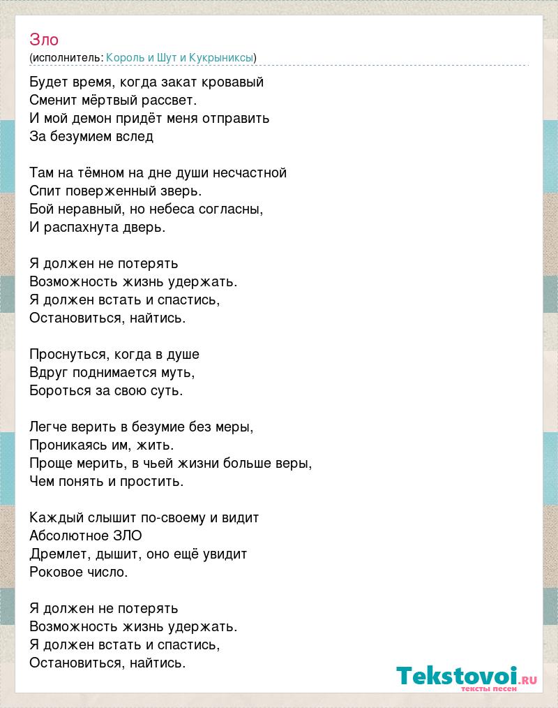 Будет время, когда закат кровавый Сменит мёртвый рассвет. И мой демон придёт меня отправить За безумием вслед Там на тёмном на дне души несчастной Спит поверженный зверь. Бой неравный, но небеса согласны, И распахнута дверь. Я должен не потерять Возможность жизнь удержать. Я должен встать и спастись, Остановиться, найтись. Проснуться, когда в душе Вдруг поднимается муть, Бороться за свою суть. Легче верить в безумие без меры, Проникаясь им, жить. Проще мерить, в чьей жизни больше веры, Чем понять и простить. Каждый слышит по-своему и видит Абсолютное ЗЛО Дремлет, дышит, оно ещё увидит Роковое число. Я должен не потерять Возможность жизнь удержать. Я должен встать и спастись, Остановиться, найтись.