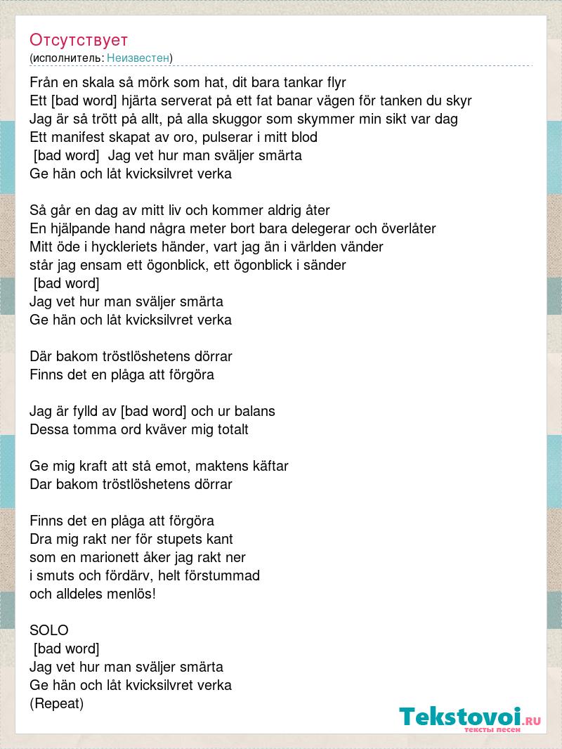 Från en skala så mörk som hat, dit bara tankar flyr Ett brustet hjärta serverat på ett fat banar vägen för tanken du skyr Jag är så trött på allt, på alla skuggor som skymmer min sikt var dag Ett manifest skapat av oro, pulserar i mitt blod (Chorus) Jag vet hur man sväljer smärta Ge hän och låt kvicksilvret verka Så går en dag av mitt liv och kommer aldrig åter En hjälpande hand några meter bort bara delegerar och överlåter Mitt öde i hyckleriets händer, vart jag än i världen vänder står jag ensam ett ögonblick, ett ögonblick i sänder (Chorus) Jag vet hur man sväljer smärta Ge hän och låt kvicksilvret verka Där bakom tröstlöshetens dörrar Finns det en plåga att förgöra Jag är fylld av fruktan och ur balans Dessa tomma ord kväver mig totalt Ge mig kraft att stå emot, maktens käftar Dar bakom tröstlöshetens dörrar Finns det en plåga att förgöra Dra mig rakt ner för stupets kant som en marionett åker jag rakt ner i smuts och fördärv, helt förstummad och alldeles menlös! SOLO (Chorus) Jag vet hur man sväljer smärta Ge hän och låt kvicksilvret verka (Repeat)