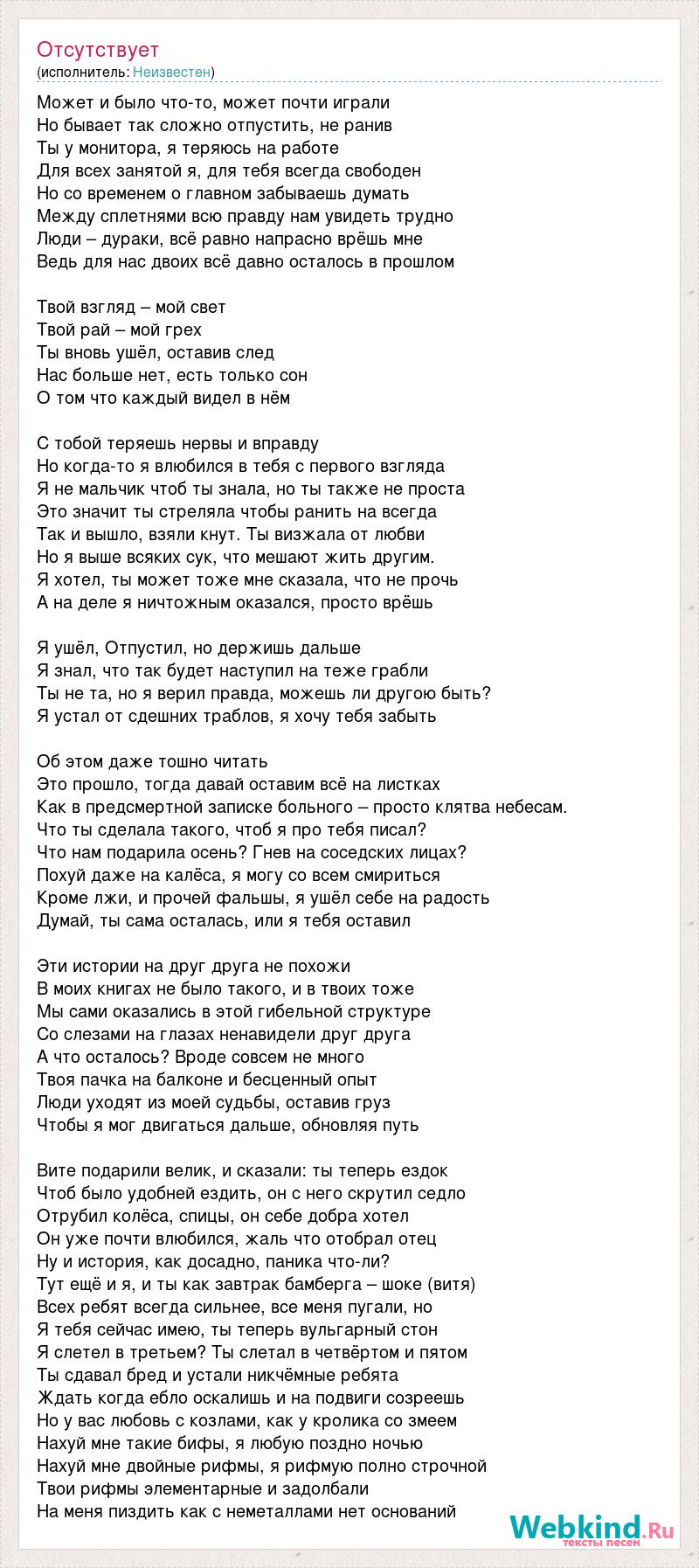 Может и было что-то, может почти играли Но бывает так сложно отпустить, не ранив Ты у монитора, я теряюсь на работе Для всех занятой я, для тебя всегда свободен Но со временем о главном забываешь думать Между сплетнями всю правду нам увидеть трудно Люди – дураки, всё равно напрасно врёшь мне Ведь для нас двоих всё давно осталось в прошлом Твой взгляд – мой свет Твой рай – мой грех Ты вновь ушёл, оставив след Нас больше нет, есть только сон О том что каждый видел в нём С тобой теряешь нервы и вправду Но когда-то я влюбился в тебя с первого взгляда Я не мальчик чтоб ты знала, но ты также не проста Это значит ты стреляла чтобы ранить на всегда Так и вышло, взяли кнут. Ты визжала от любви Но я выше всяких сук, что мешают жить другим. Я хотел, ты может тоже мне сказала, что не прочь А на деле я ничтожным оказался, просто врёшь Я ушёл, Отпустил, но держишь дальше Я знал, что так будет наступил на теже грабли Ты не та, но я верил правда, можешь ли другою быть? Я устал от сдешних траблов, я хочу тебя забыть Об этом даже тошно читать Это прошло, тогда давай оставим всё на листках Как в предсмертной записке больного – просто клятва небесам. Что ты сделала такого, чтоб я про тебя писал? Что нам подарила осень? Гнев на соседских лицах? Похуй даже на калёса, я могу со всем смириться Кроме лжи, и прочей фальшы, я ушёл себе на радость Думай, ты сама осталась, или я тебя оставил Эти истории на друг друга не похожи В моих книгах не было такого, и в твоих тоже Мы сами оказались в этой гибельной структуре Со слезами на глазах ненавидели друг друга А что осталось? Вроде совсем не много Твоя пачка на балконе и бесценный опыт Люди уходят из моей судьбы, оставив груз Чтобы я мог двигаться дальше, обновляя путь Вите подарили велик, и сказали: ты теперь ездок Чтоб было удобней ездить, он с него скрутил седло Отрубил колёса, спицы, он себе добра хотел Он уже почти влюбился, жаль что отобрал отец Ну и история, как досадно, паника что-ли? Тут ещё и я, и ты как завтрак бамберга – шоке (витя) Всех ребят всегда сильнее, все меня пугали, но Я тебя сейчас имею, ты теперь вульгарный стон Я слетел в третьем? Ты слетал в четвёртом и пятом Ты сдавал бред и устали никчёмные ребята Ждать когда ебло оскалишь и на подвиги созреешь Но у вас любовь с козлами, как у кролика со змеем Нахуй мне такие бифы, я любую поздно ночью Нахуй мне двойные рифмы, я рифмую полно строчной Твои рифмы элементарные и задолбали На меня пиздить как с неметаллами нет оснований