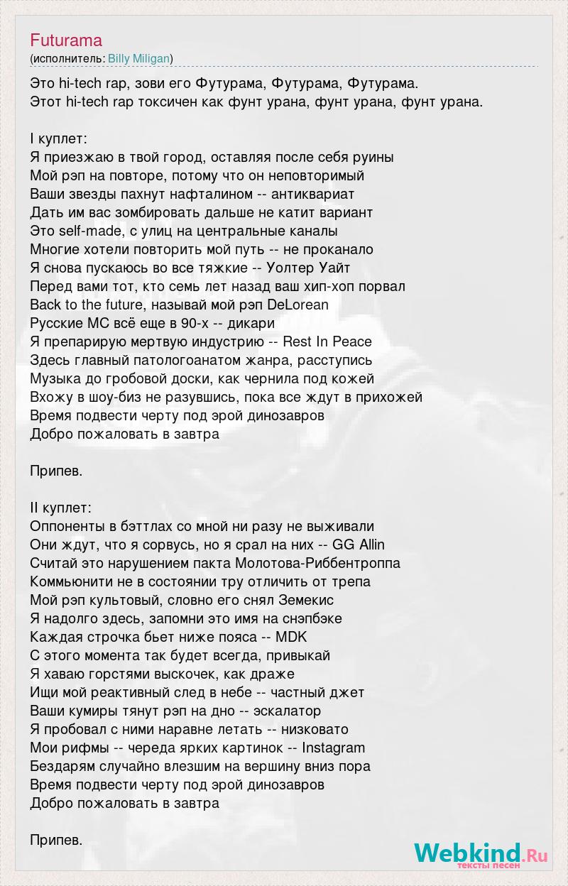 Это hi-tech rap, зови его Футурама, Футурама, Футурама. Этот hi-tech rap токсичен как фунт урана, фунт урана, фунт урана. I куплет: Я приезжаю в твой город, оставляя после себя руины Мой рэп на повторе, потому что он неповторимый Ваши звезды пахнут нафталином -- антиквариат Дать им вас зомбировать дальше не катит вариант Это self-made, с улиц на центральные каналы Многие хотели повторить мой путь -- не проканало Я снова пускаюсь во все тяжкие -- Уолтер Уайт Перед вами тот, кто семь лет назад ваш хип-хоп порвал Back to the future, называй мой рэп DeLorean Русские MC всё еще в 90-х -- дикари Я препарирую мертвую индустрию -- Rest In Peace Здесь главный патологоанатом жанра, расступись Музыка до гробовой доски, как чернила под кожей Вхожу в шоу-биз не разувшись, пока все ждут в прихожей Время подвести черту под эрой динозавров Добро пожаловать в завтра Припев. II куплет: Оппоненты в бэттлах со мной ни разу не выживали Они ждут, что я сорвусь, но я срал на них -- GG Allin Считай это нарушением пакта Молотова-Риббентроппа Коммьюнити не в состоянии тру отличить от трепа Мой рэп культовый, словно его снял Земекис Я надолго здесь, запомни это имя на снэпбэке Каждая строчка бьет ниже пояса -- MDK С этого момента так будет всегда, привыкай Я хаваю горстями выскочек, как драже Ищи мой реактивный след в небе -- частный джет Ваши кумиры тянут рэп на дно -- эскалатор Я пробовал с ними наравне летать -- низковато Мои рифмы -- череда ярких картинок -- Instagram Бездарям случайно влезшим на вершину вниз пора Время подвести черту под эрой динозавров Добро пожаловать в завтра Припев.