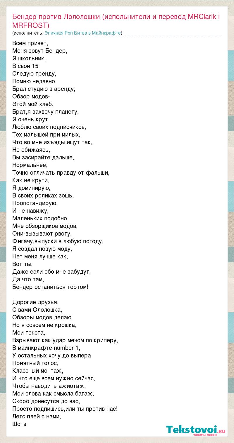 Всем привет, Меня зовут Бендер, Я школьник, В свои 15 Следую тренду, Помню недавно Брал студию в аренду, Обзор модов- Этой мой хлеб. Брат,я захвочу планету, Я очень крут, Люблю своих подписчиков, Тех малышей при милых, Что во мне изъяды ищут так, Не обижаясь, Вы засирайте дальше, Нормальнее, Точно отличать правду от фальши, Как не крути, Я доминирую, В своих роликах зошь, Пропогандирую. И не навижу, Маленьких подобно Мне обзорщиков модов, Они-вызывают рвоту, Фигачу,выпуски в любую погоду, Я создал новую моду, Нет меня лучше как, Вот ты, Даже если обо мне забудут, Да что там, Бендер останиться тортом! Дорогие друзья, С вами Ололошка, Обзоры модов делаю Но я совсем не крошка, Мои текста, Взрывают как удар мечом по криперу, В майнкрафте number 1, У остальных хочу до выпера Приятный голос, Классный монтаж, И что еще всем нужно сейчас, Чтобы наводить ажиотаж, Мои слова как смысла багаж, Скоро донесутся до вас, Просто подпишись,или ты против нас! Летс плей с нами, Шотэ