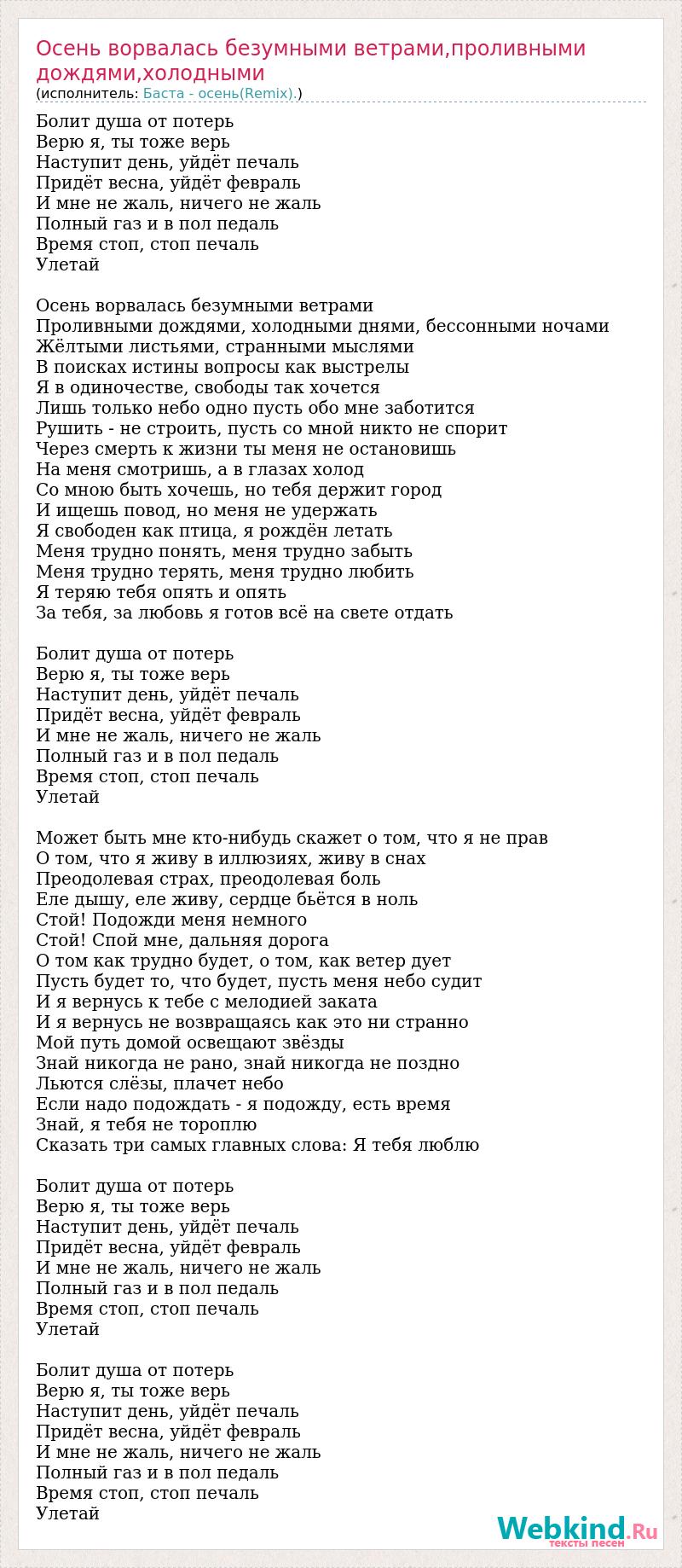 Болит душа от потерь Верю я, ты тоже верь Наступит день, уйдёт печаль Придёт весна, уйдёт февраль И мне не жаль, ничего не жаль Полный газ и в пол педаль Время стоп, стоп печаль Улетай Осень ворвалась безумными ветрами Проливными дождями, холодными днями, бессонными ночами Жёлтыми листьями, странными мыслями В поисках истины вопросы как выстрелы Я в одиночестве, свободы так хочется Лишь только небо одно пусть обо мне заботится Рушить - не строить, пусть со мной никто не спорит Через смерть к жизни ты меня не остановишь На меня смотришь, а в глазах холод Со мною быть хочешь, но тебя держит город И ищешь повод, но меня не удержать Я свободен как птица, я рождён летать Меня трудно понять, меня трудно забыть Меня трудно терять, меня трудно любить Я теряю тебя опять и опять За тебя, за любовь я готов всё на свете отдать Болит душа от потерь Верю я, ты тоже верь Наступит день, уйдёт печаль Придёт весна, уйдёт февраль И мне не жаль, ничего не жаль Полный газ и в пол педаль Время стоп, стоп печаль Улетай Может быть мне кто-нибудь скажет о том, что я не прав О том, что я живу в иллюзиях, живу в снах Преодолевая страх, преодолевая боль Еле дышу, еле живу, сердце бьётся в ноль Стой! Подожди меня немного Стой! Спой мне, дальняя дорога О том как трудно будет, о том, как ветер дует Пусть будет то, что будет, пусть меня небо судит И я вернусь к тебе с мелодией заката И я вернусь не возвращаясь как это ни странно Мой путь домой освещают звёзды Знай никогда не рано, знай никогда не поздно Льются слёзы, плачет небо Если надо подождать - я подожду, есть время Знай, я тебя не тороплю Сказать три самых главных слова: Я тебя люблю Болит душа от потерь Верю я, ты тоже верь Наступит день, уйдёт печаль Придёт весна, уйдёт февраль И мне не жаль, ничего не жаль Полный газ и в пол педаль Время стоп, стоп печаль Улетай Болит душа от потерь Верю я, ты тоже верь Наступит день, уйдёт печаль Придёт весна, уйдёт февраль И мне не жаль, ничего не жаль Полный газ и в пол педаль Время стоп, стоп печаль Улетай