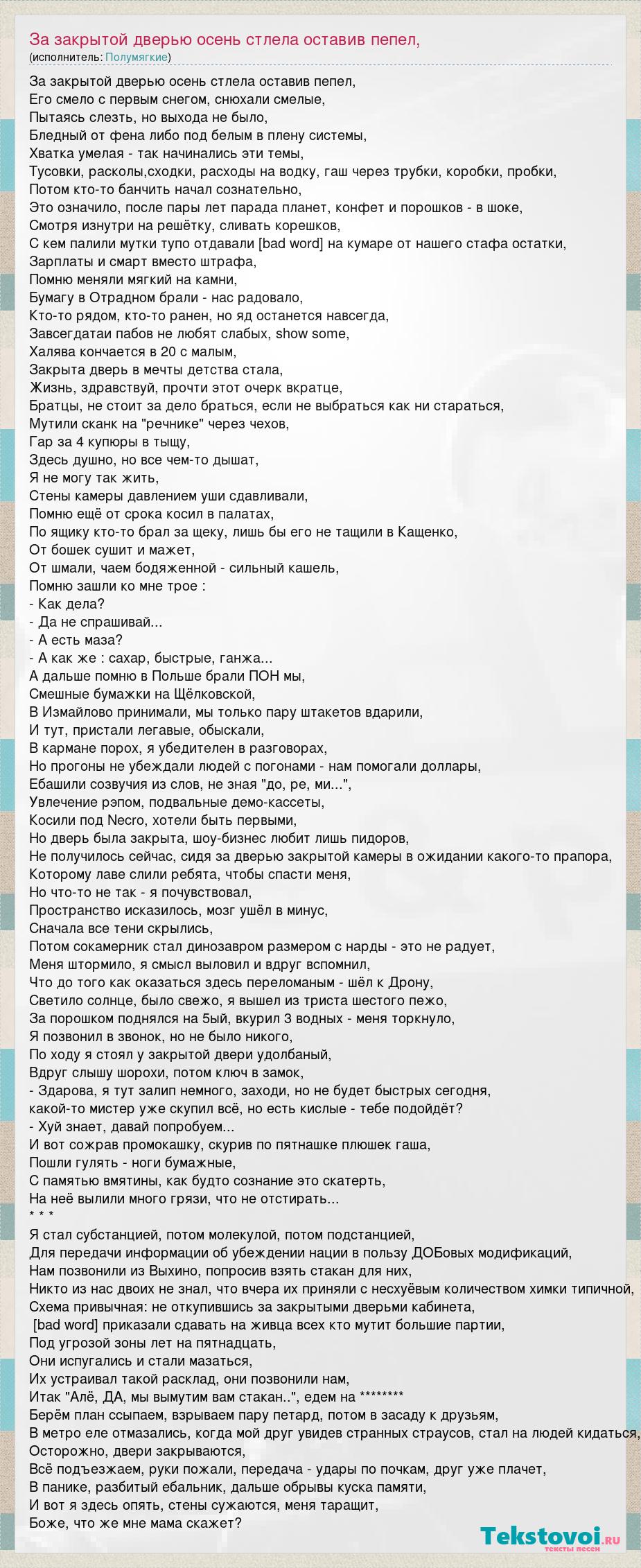 За закрытой дверью осень стлела оставив пепел, Его смело с первым снегом, снюхали смелые, Пытаясь слезть, но выхода не было, Бледный от фена либо под белым в плену системы, Хватка умелая - так начинались эти темы, Тусовки, расколы,сходки, расходы на водку, гаш через трубки, коробки, пробки, Потом кто-то банчить начал сознательно, Это означило, после пары лет парада планет, конфет и порошков - в шоке, Смотря изнутри на решётку, сливать корешков, С кем палили мутки тупо отдавали [bad word] на кумаре от нашего стафа остатки, Зарплаты и смарт вместо штрафа, Помню меняли мягкий на камни, Бумагу в Отрадном брали - нас радовало, Кто-то рядом, кто-то ранен, но яд останется навсегда, Завсегдатаи пабов не любят слабых, show some, Халява кончается в 20 с малым, Закрыта дверь в мечты детства стала, Жизнь, здравствуй, прочти этот очерк вкратце, Братцы, не стоит за дело браться, если не выбраться как ни стараться, Мутили сканк на "речнике" через чехов, Гар за 4 купюры в тыщу, Здесь душно, но все чем-то дышат, Я не могу так жить, Стены камеры давлением уши сдавливали, Помню ещё от срока косил в палатах, По ящику кто-то брал за щеку, лишь бы его не тащили в Кащенко, От бошек сушит и мажет, От шмали, чаем бодяженной - сильный кашель, Помню зашли ко мне трое : - Как дела? - Да не спрашивай... - А есть маза? - А как же : сахар, быстрые, ганжа... А дальше помню в Польше брали ПОН мы, Смешные бумажки на Щёлковской, В Измайлово принимали, мы только пару штакетов вдарили, И тут, пристали легавые, обыскали, В кармане порох, я убедителен в разговорах, Но прогоны не убеждали людей c погонами - нам помогали доллары, Ебашили созвучия из слов, не зная "до, ре, ми...", Увлечение рэпом, подвальные демо-кассеты, Косили под Necro, хотели быть первыми, Но дверь была закрыта, шоу-бизнес любит лишь пидоров, Не получилось сейчас, сидя за дверью закрытой камеры в ожидании какого-то прапора, Которому лаве слили ребята, чтобы спасти меня, Но что-то не так - я почувствовал, Пространство исказилось, мозг ушёл в минус, Сначала все тени скрылись, Потом сокамерник стал динозавром размером с нарды - это не радует, Меня штормило, я смысл выловил и вдруг вспомнил, Что до того как оказаться здесь переломаным - шёл к Дрону, Светило солнце, было свежо, я вышел из триста шестого пежо, За порошком поднялся на 5ый, вкурил 3 водных - меня торкнуло, Я позвонил в звонок, но не было никого, По ходу я стоял у закрытой двери удолбаный, Вдруг слышу шорохи, потом ключ в замок, - Здарова, я тут залип немного, заходи, но не будет быстрых сегодня, какой-то мистер уже скупил всё, но есть кислые - тебе подойдёт? - Хуй знает, давай попробуем... И вот сожрав промокашку, скурив по пятнашке плюшек гаша, Пошли гулять - ноги бумажные, С памятью вмятины, как будто сознание это скатерть, На неё вылили много грязи, что не отстирать... * * * Я стал субстанцией, потом молекулой, потом подстанцией, Для передачи информации об убеждении нации в пользу ДОБовых модификаций, Нам позвонили из Выхино, попросив взять стакан для них, Никто из нас двоих не знал, что вчера их приняли с несхуёвым количеством химки типичной, Схема привычная: не откупившись за закрытыми дверьми кабинета, [bad word] приказали сдавать на живца всех кто мутит большие партии, Под угрозой зоны лет на пятнадцать, Они испугались и стали мазаться, Их устраивал такой расклад, они позвонили нам, Итак "Алё, ДА, мы вымутим вам стакан..", едем на *